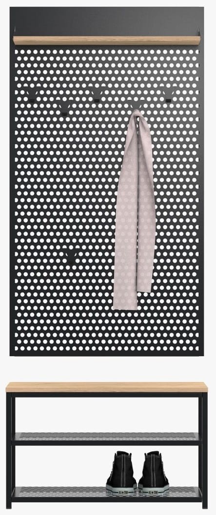 Loft 2W to praktyczny i trwały zestaw do przedpokoju. Prezentowane meble zostały stworzone po to, żeby dzięki kompaktowym wymiarom zaoszczędzić miejsce oraz pozwolić na funkcjonalne zagospodarowanie przestrzeni w niewielkich pomieszczeniach zachowując pełnię funkcjonalności. Zestaw zawiera wszystko co niezbędne w przedpokoju: szafkę wyposażoną w dwie otwarte półki do przechowywania obuwia pozwalające pomieścić około 6 par butów oraz wygodny blat, który może posłużyć za siedzisko i wieszak wyposażony siedem haczyków do wieszania ubrań czy torebek oraz funkcjonalną półkę. Meble wykonane zostały z modnego połączenia metalu polakierowanego na kolor czarny i płyty laminowanej w kolorze dąb wotan. Kolekcja Loft zawiera lekkie i minimalistyczne bryły, które odnajdą się w każdym przedpokoju w stylu nowoczesnym, industrialnym, lofotwym.