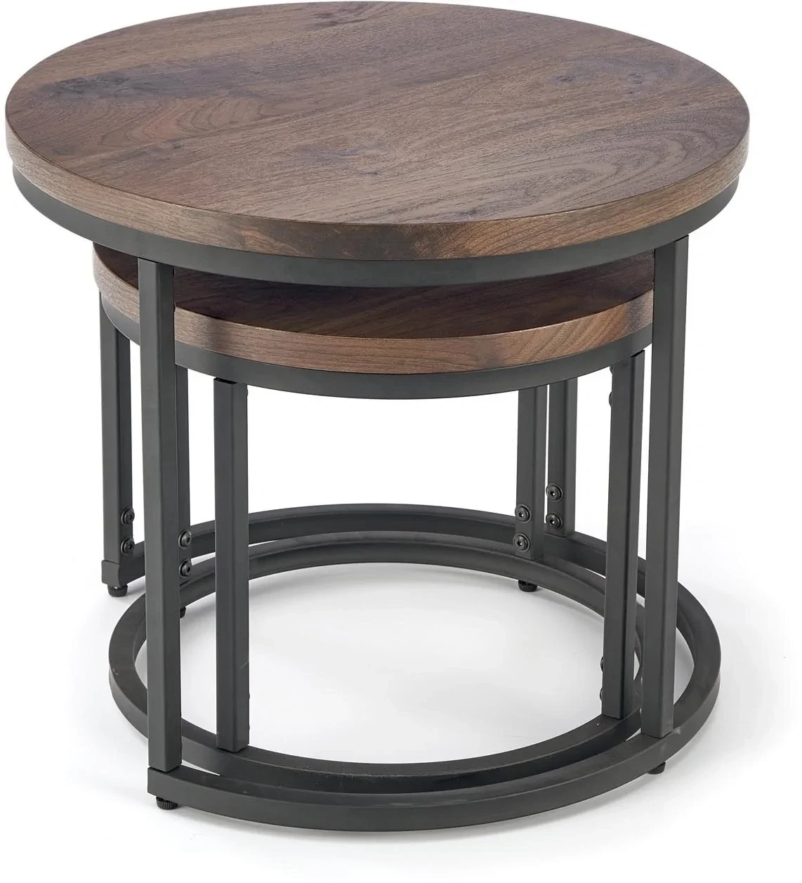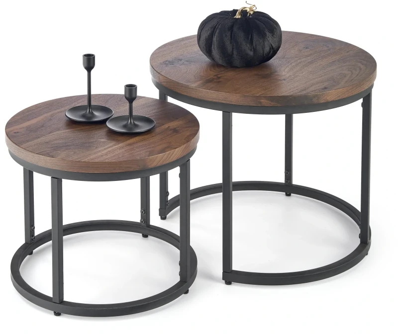 Zestaw dwóch ław OREO to połączenie elegancji i funkcjonalności w nowoczesnym wydaniu. Okrągłe blaty w kolorze orzecha doskonale komponują się z czarnym, metalowym stelażem, tworząc modny, loftowy wygląd. Dzięki różnym rozmiarom ławki można ustawić razem – jedna pod drugą – lub osobno, w zależności od potrzeb i przestrzeni w salonie.