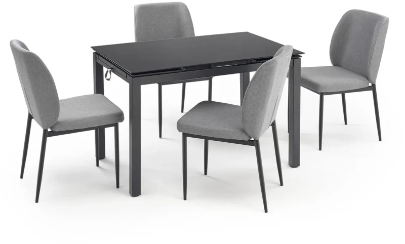Zestaw JASPER to eleganckie połączenie funkcjonalności i stylu, które doskonale sprawdzi się w jadalni lub salonie. Rozkładany stół z możliwością wydłużenia blatu z 110 cm do 170 cm pozwala dopasować przestrzeń do liczby gości, zapewniając komfort podczas wspólnych posiłków. Szklany, czarny blat w połączeniu z metalowymi nogami nadaje całości nowoczesnego i lekkiego charakteru.