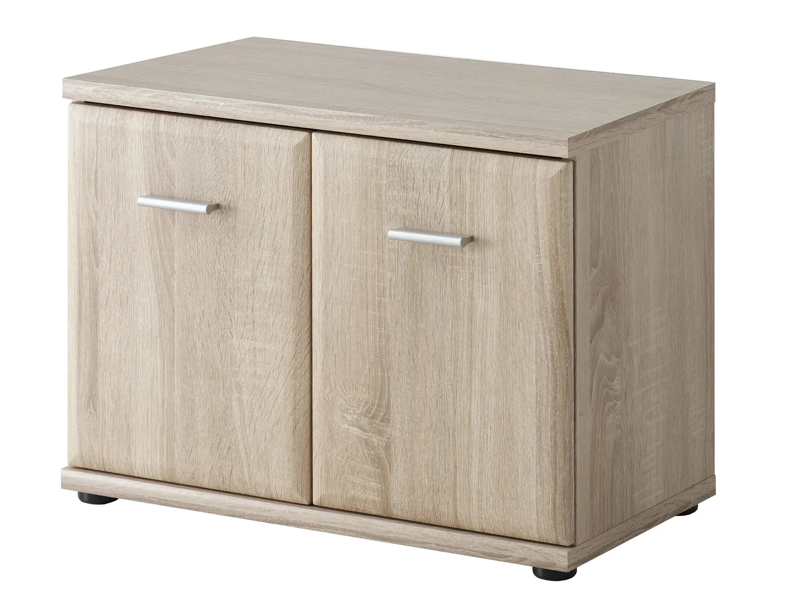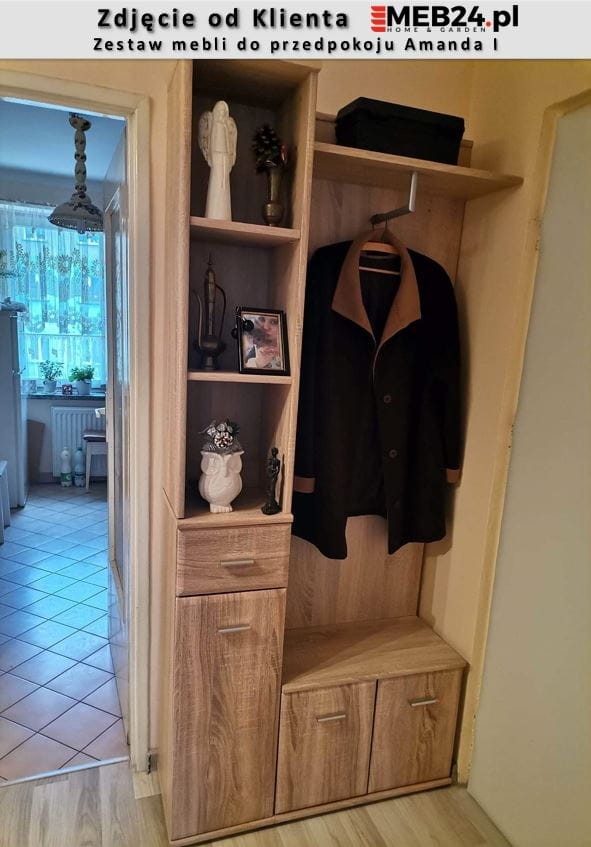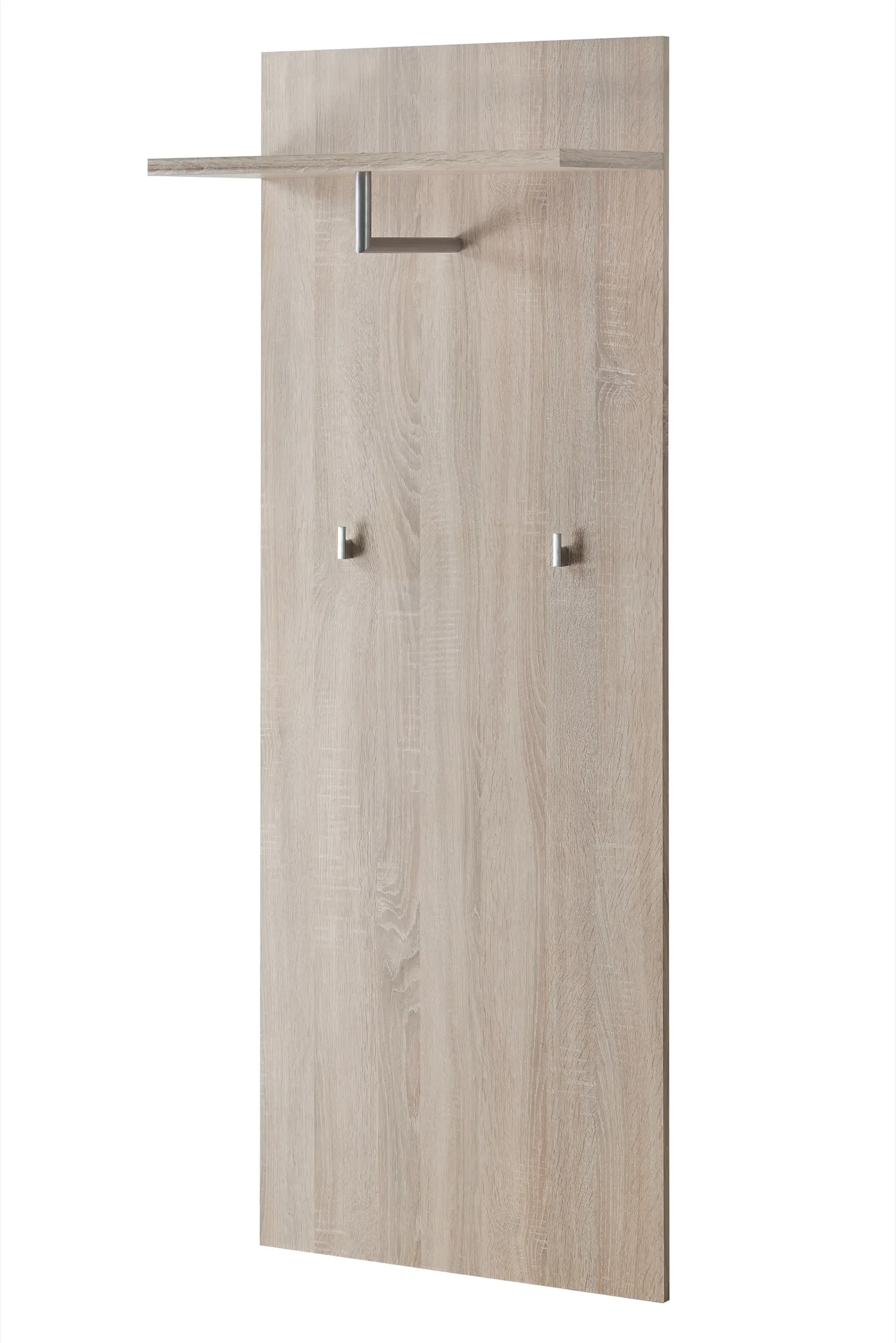 Zestaw mebli do przedpokoju Amario I charakteryzuje się funkcjonalnością i ciepłą estetyką dębu sonoma, co sprawia, że pasuje do wielu wnętrz dzięki swojej uniwersalnej kolorystyce. Słupek oferuje praktyczne rozwiązanie do przechowywania dzięki dwóm otwartym półkom, szufladzie oraz szafce z pojedynczymi drzwiczkami, co pozwala na zorganizowanie różnorodnych przedmiotów, od odzieży po akcesoria. Panel wieszakowy wyposażony jest w półkę, pod którą znajduje się prostopadły wieszak oraz dwa osobne zawieszki na ścianie, oferując przestrzeń na odzież wierzchnią i dodatkowe akcesoria. Szafka z podwójnymi drzwiczkami zapewnia kolejną przestrzeń do przechowywania, idealną na większe przedmioty.