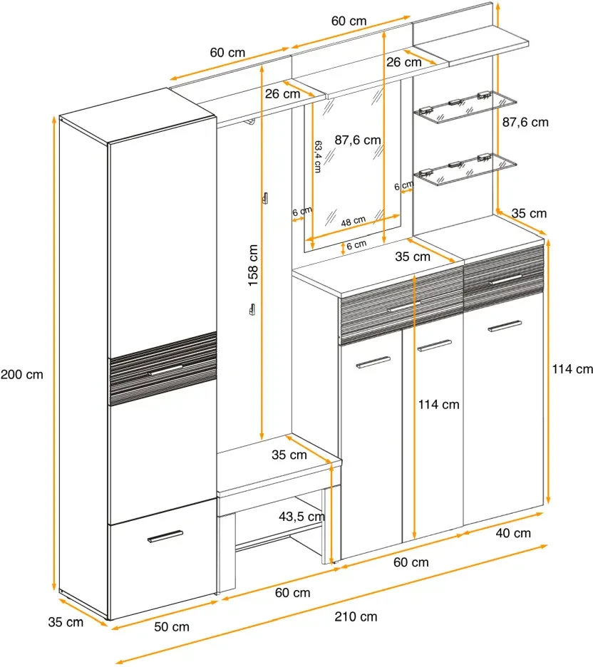 - Całość: ~210 cm (szerokość) x 200 cm (wysokość) x 35 cm (głębokość)
