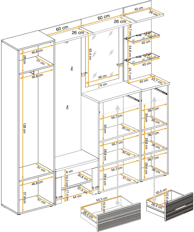- Wszechstronność przechowywania: Zestaw Gustavo IX zapewnia bogactwo miejsca do przechowywania, dzięki różnorodnym elementom takim jak słupek z drążkiem i półką, panel z wieszakami, szafka-ławeczka, komoda oraz dodatkowy słupek z półkami i oświetleniem LED. Dzięki temu każdy element odzieży i akcesoriów znajdzie swoje miejsce, pomagając utrzymać porządek w przedpokoju.