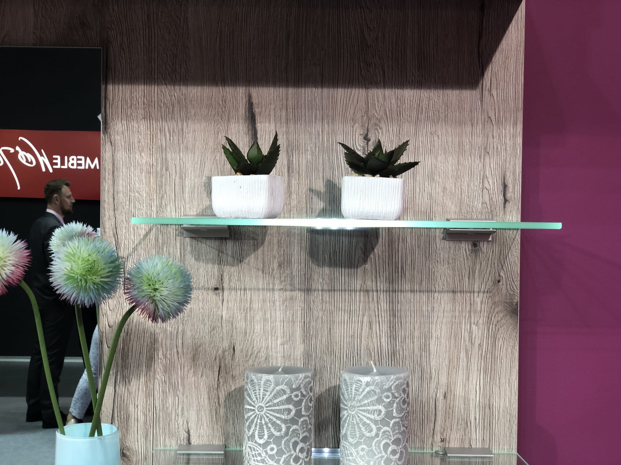 - Wyposażenie: Słupek z półką i drążkiem na wieszaki, panel tapicerowany z półką i 4 wieszakami, szafka na buty z półką, lustro z półką, komoda z szufladą i półkami, słupek z trzema półkami (dwie szklane z LED) i szafką z szufladą