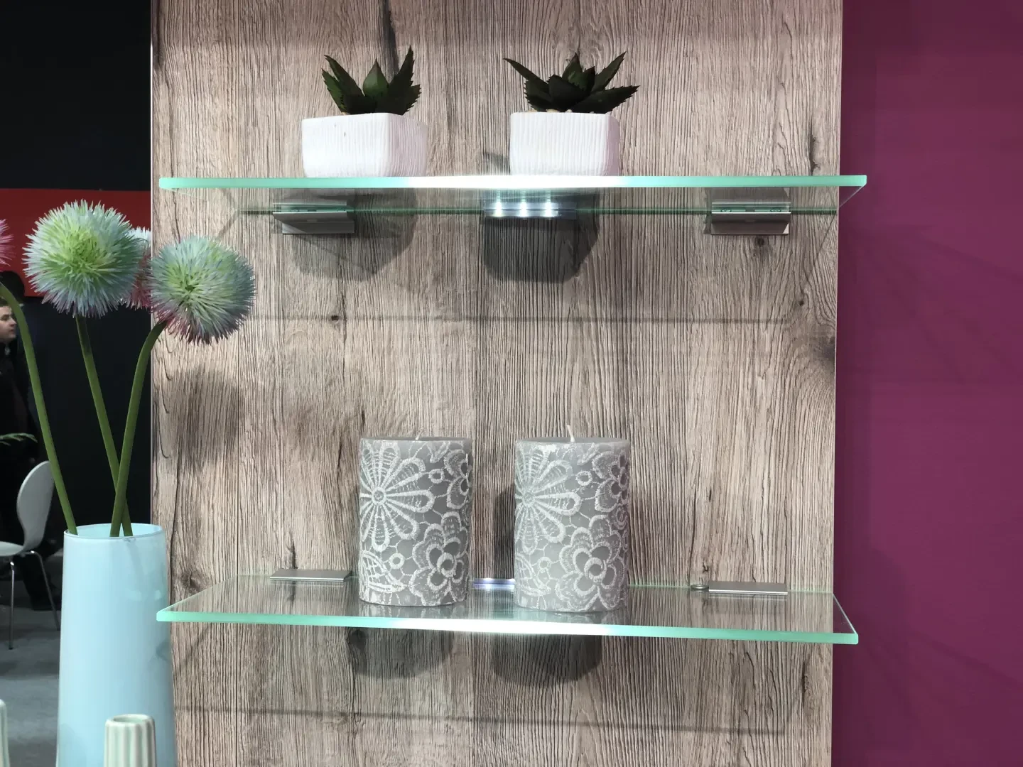 - Dodatkowe elementy: System oświetlenia LED na szklanych półkach
