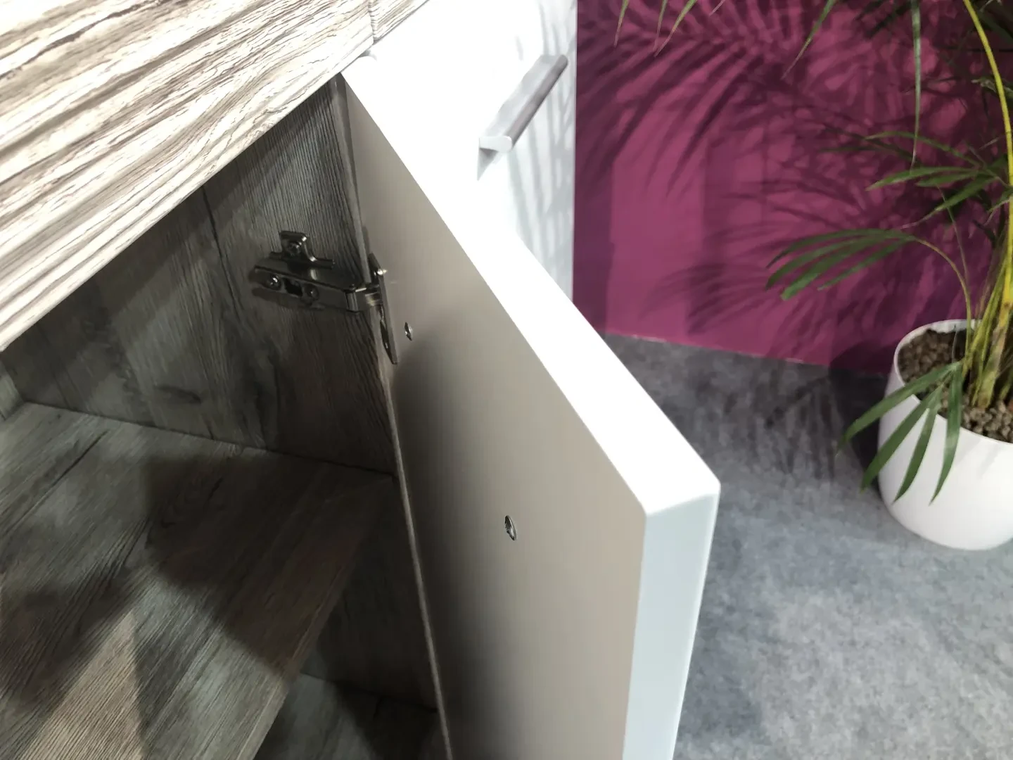 - Front: Biały połysk PVC i dąb Wellington PVC (ryflowany)