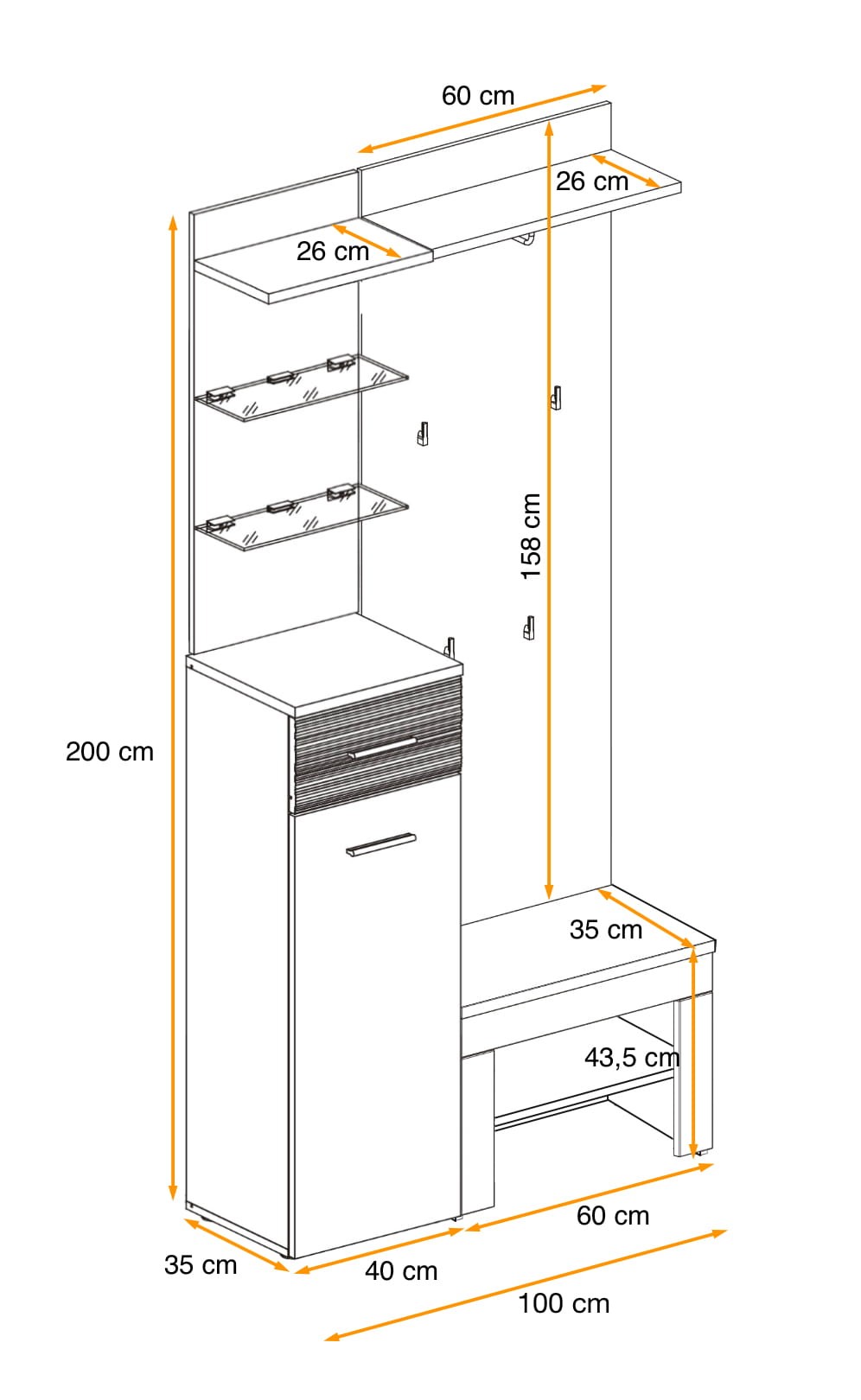 - Całość: 100 cm (szerokość) x 200 cm (wysokość) x 35 cm (głębokość)