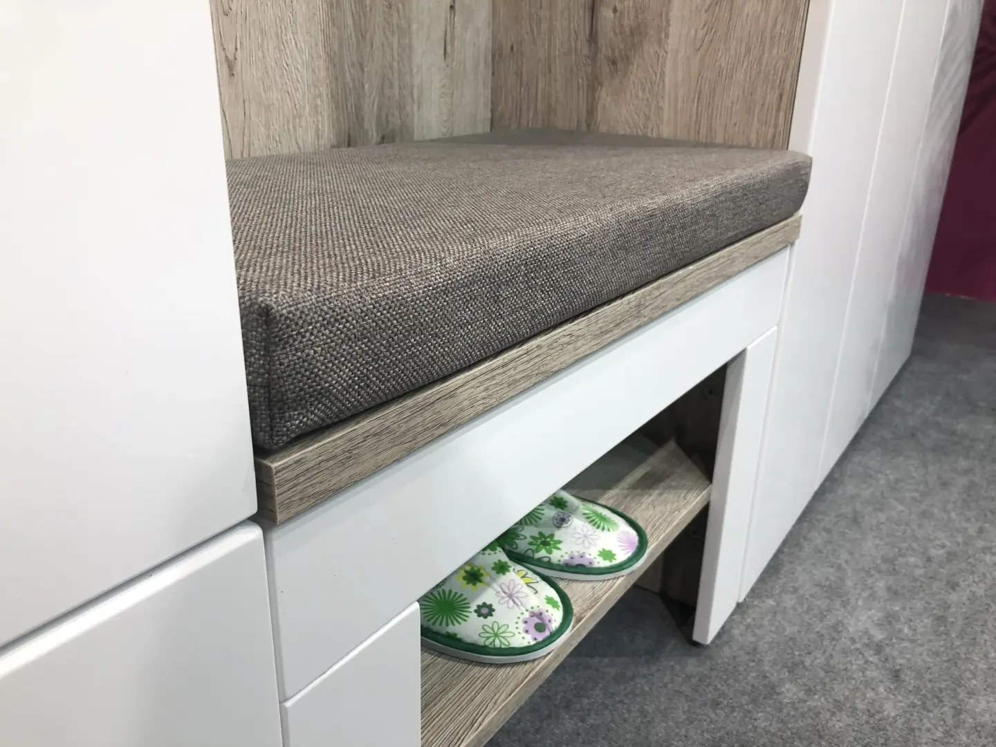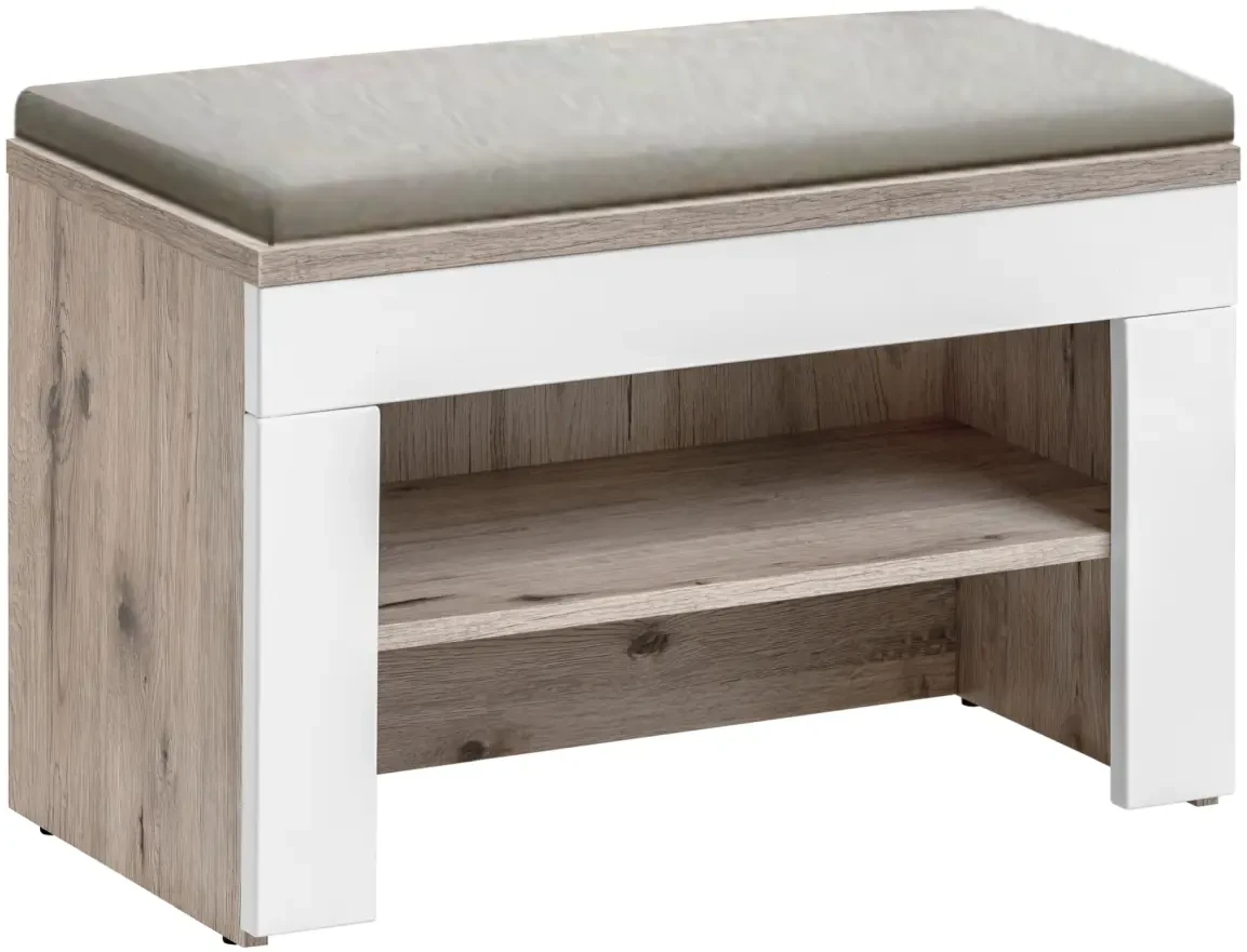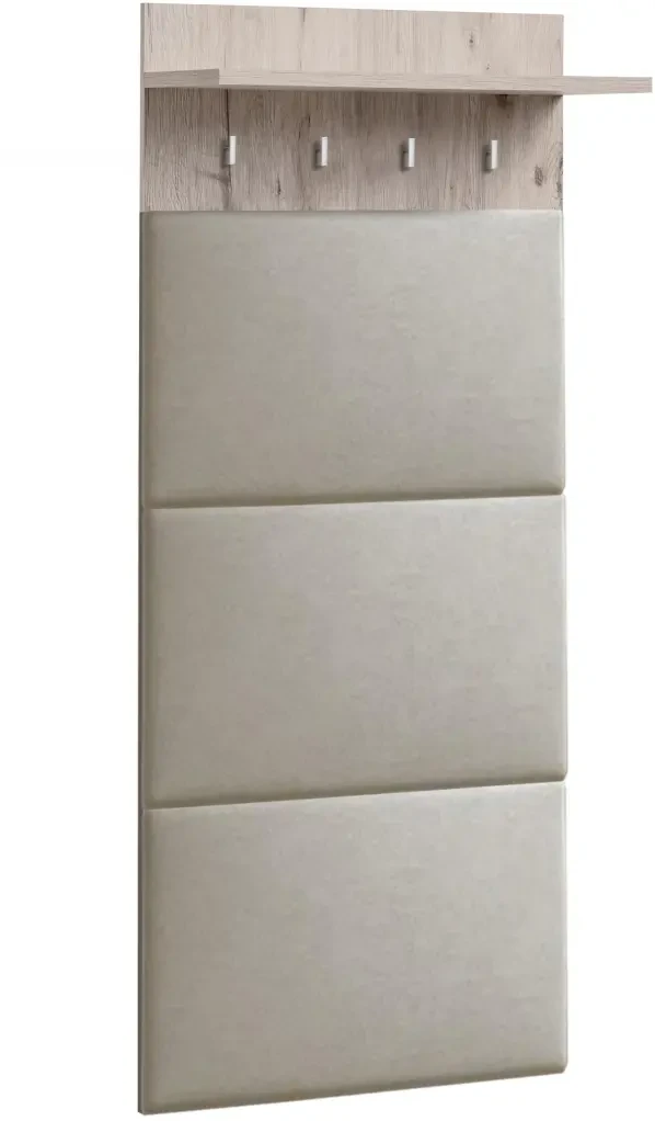 - Wyposażenie: Panel tapicerowany z półką i 4 wieszakami, szafka na buty z siedziskiem i półką, lustro z półką, komoda z szufladą i drzwiczkami kryjącymi 2 półki
