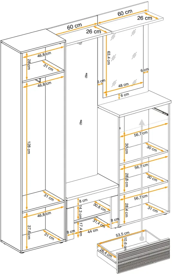 - Szafka na buty: 60 cm (szerokość) x 44 cm (wysokość) x 35 cm (głębokość)