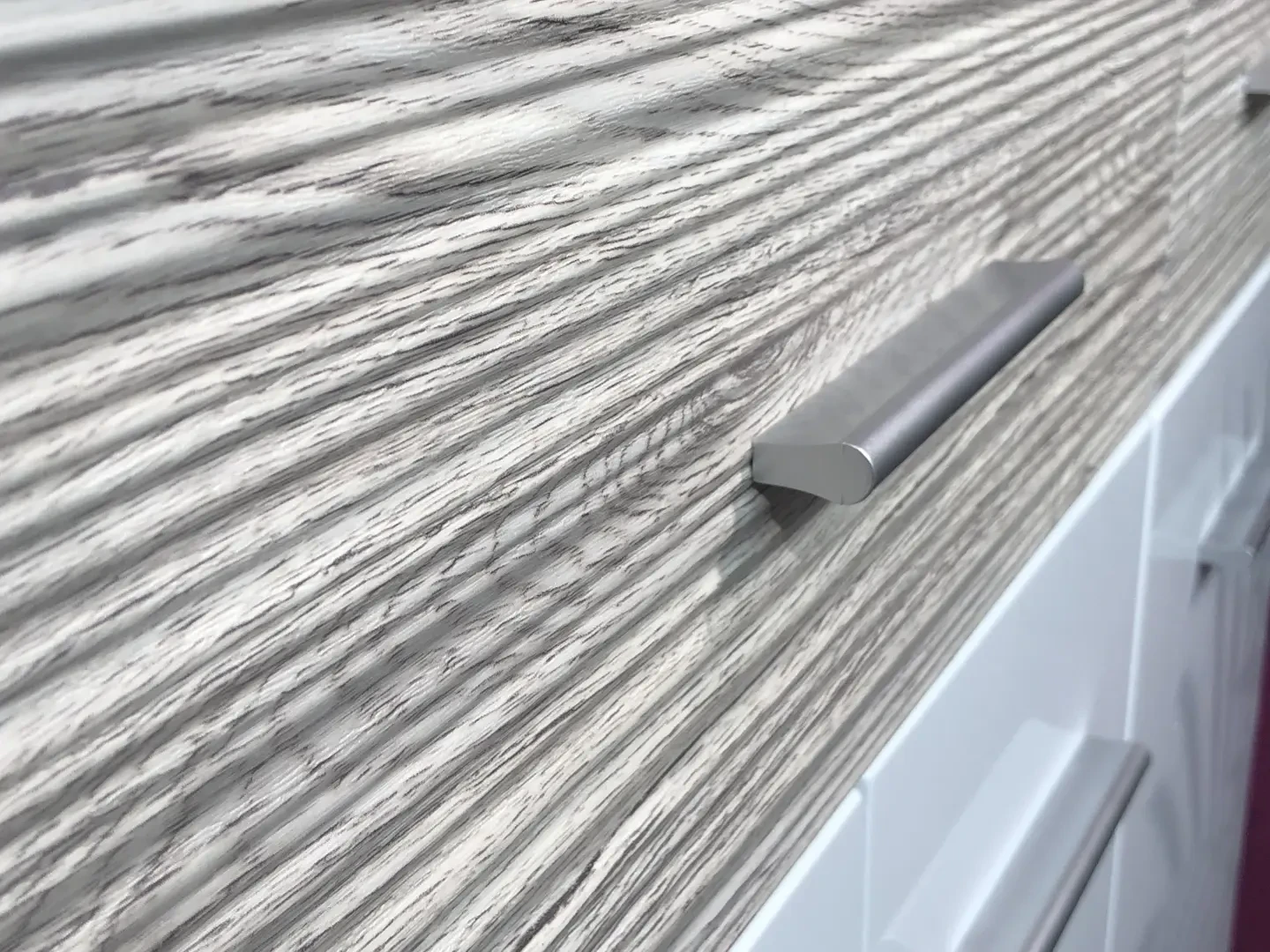 - Front: Biały połysk PVC i dąb Wellington PVC (ryflowany)