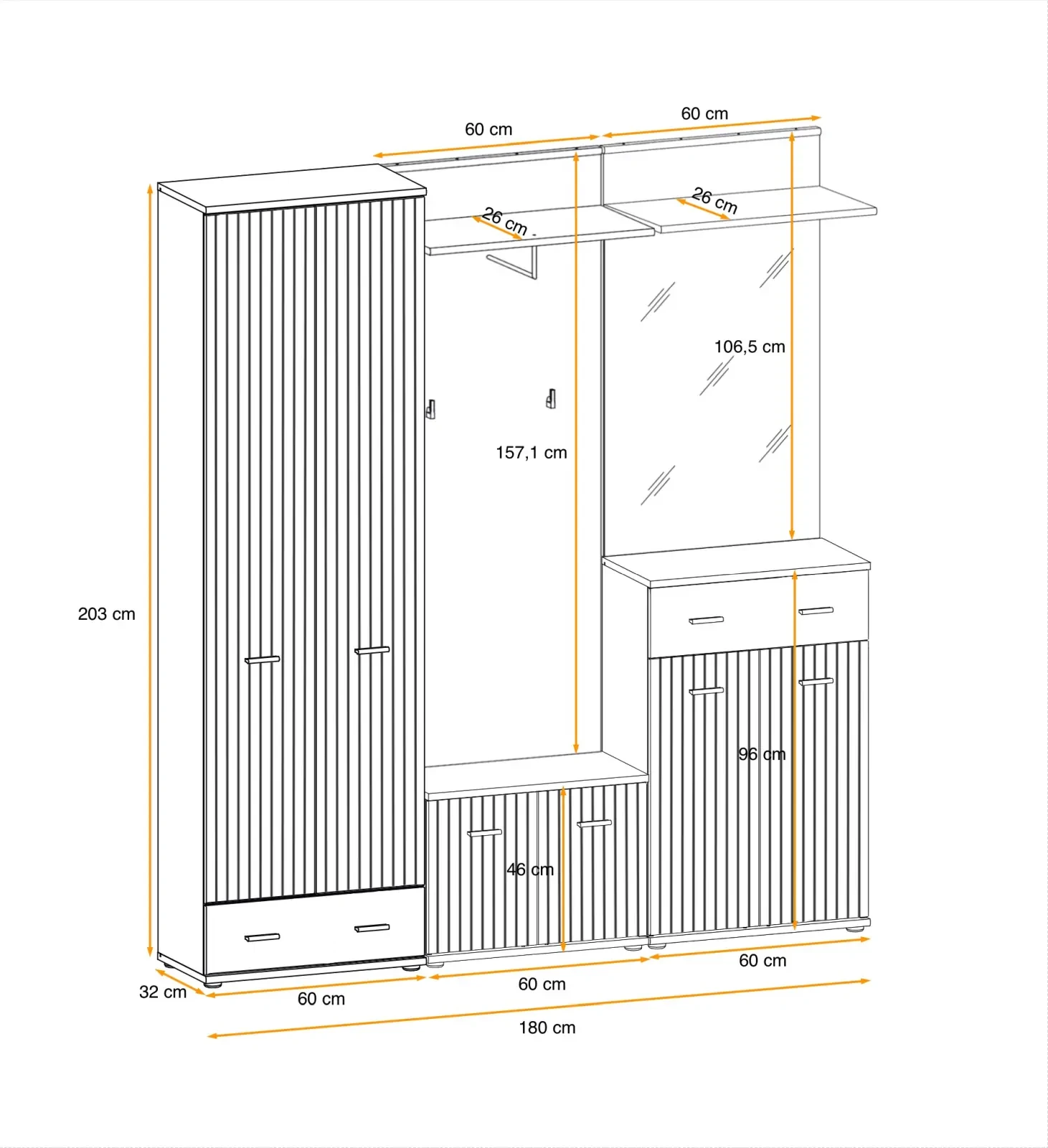 - Szafa: 60 cm szerokości, 203 cm wysokości, 32 cm głębokości.
