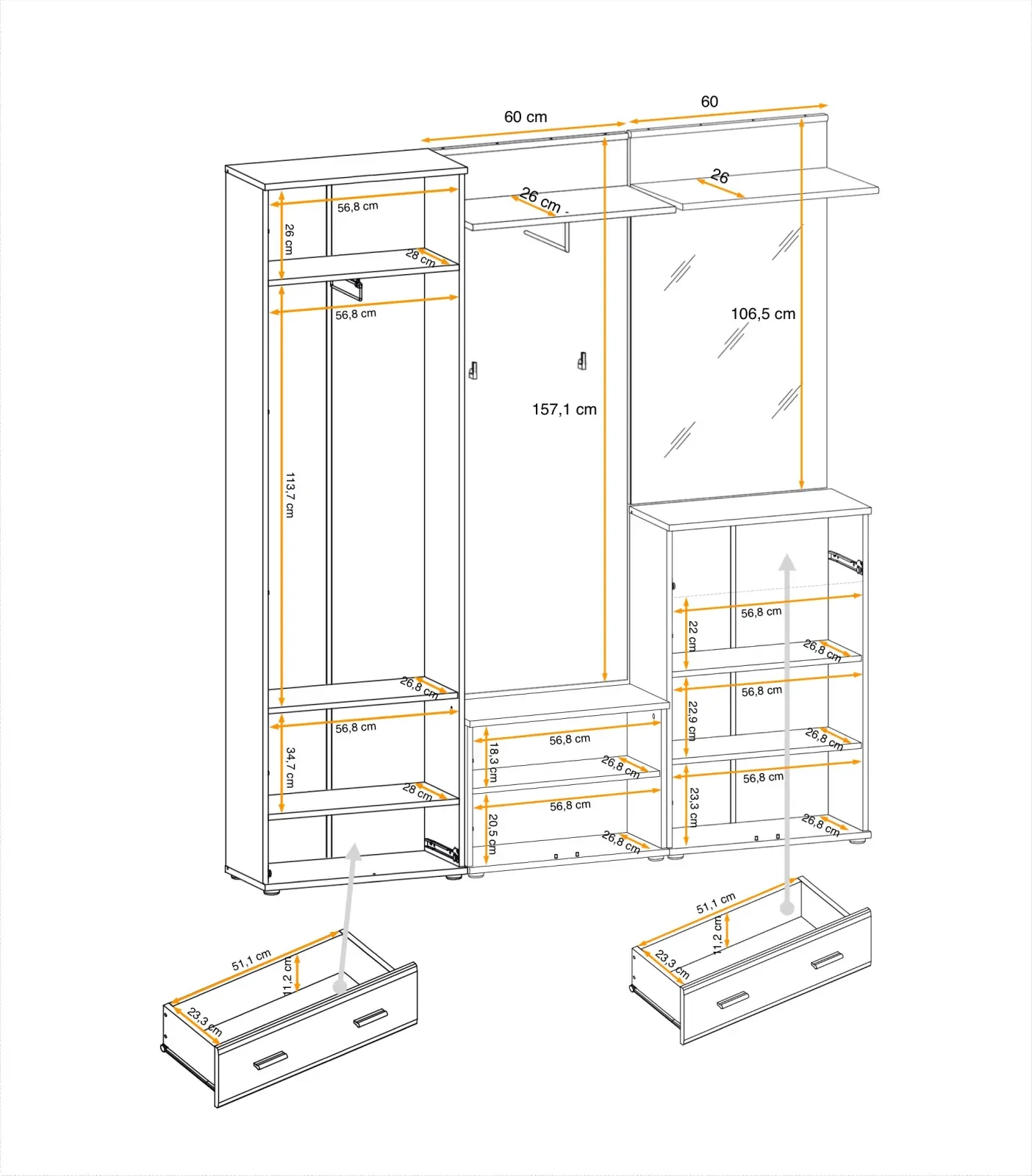 - Szafka na buty: 60 cm szerokości, 46 cm wysokości, 32 cm głębokości.