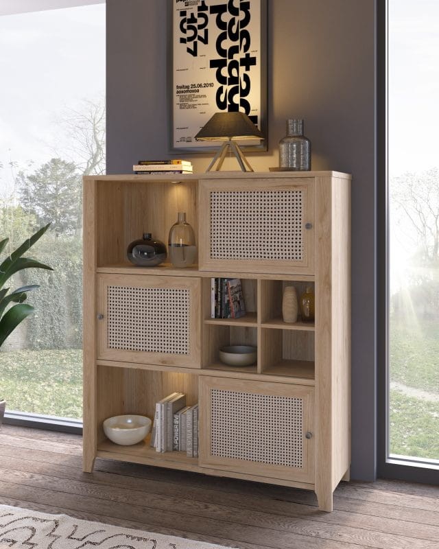 Zestaw mebli Parilla to stylowy i oryginalny set do salonu w stylu boho. W zestawie znajdują się szafka RTV, komoda z szufladami, komoda z drzwiczkami przesuwnymi, witryna z oświetleniem LED, stolik oraz dwie półki wiszące. Korpus mebli wykonano z odpornej na uszkodzenia mechaniczne płyty laminowanej o grubości 16 mm, a fronty z wysokiej jakości płyty MDF, dzięki czemu zestaw zachowa swój atrakcyjny wygląd przez długi czas. Dodatkowym wizualnym atutem mebli z serii Parilla jest dekor z okleiną w postaci folii finisz amadeus. Prosty i minimalistyczny design sprawia, że zestaw świetnie sprawdzi się zarówno we wnętrzach naturalistycznych, skandynawskich jak i boho, gdzie królują oszczędność formy i naturalne, jasne kolory. Meble znajdą swoje miejsce zarówno salonie, pokoju dziennym, jak i również w sypialni.