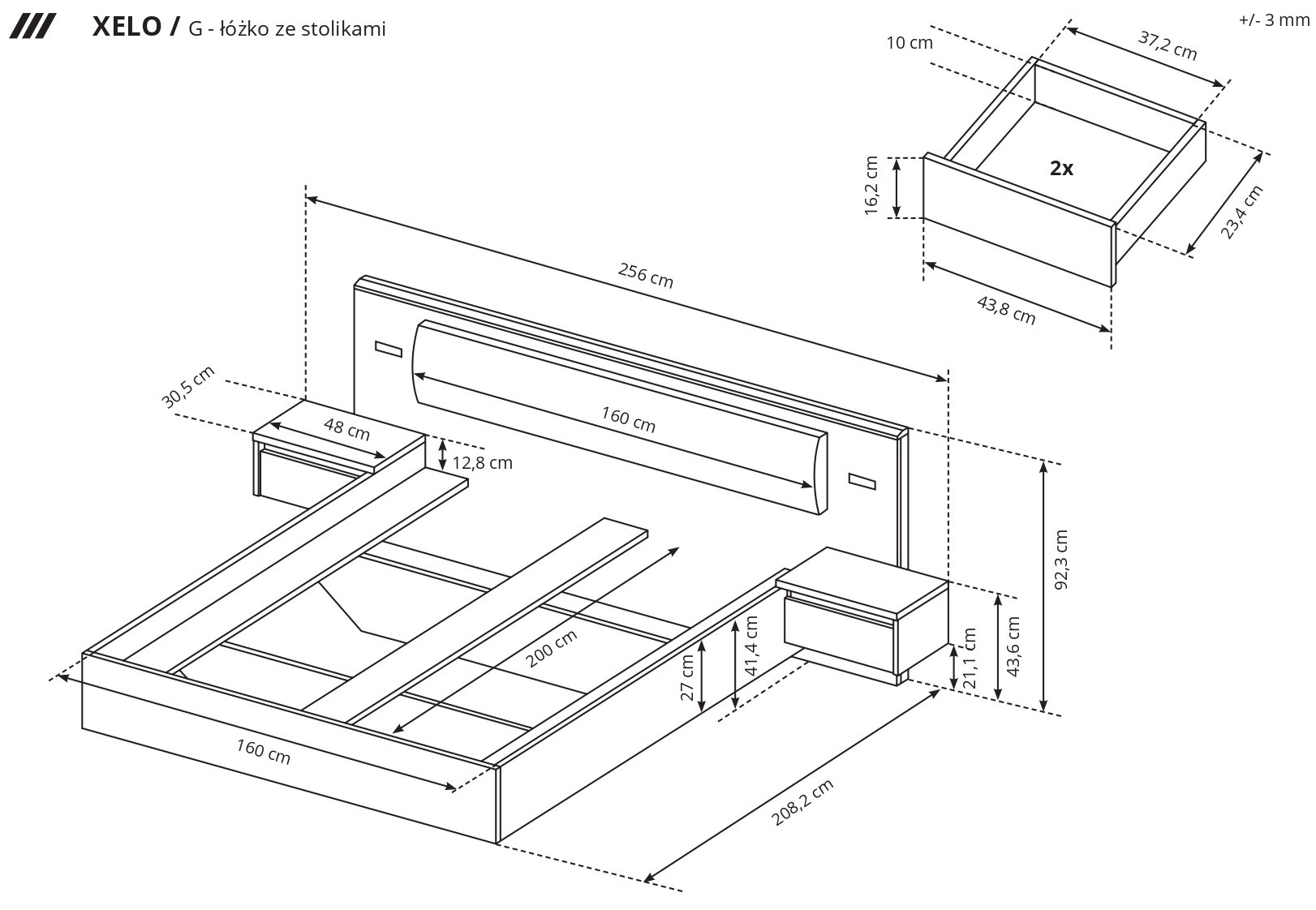 Wymiary mebli sypialnianych Xelo: