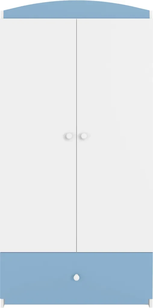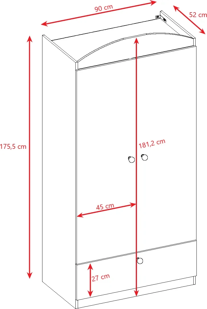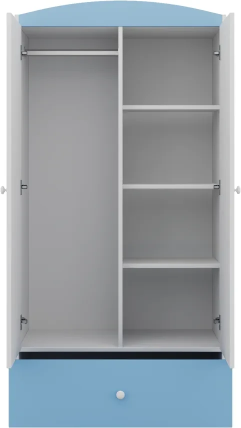- Szafa dwudrzwiowa stojąca posiada drążek umożliwiający zawieszenie kurtek i bluz, pojemną szufladę na prowadnicach kulkowych oraz 4 półki na ubrania.