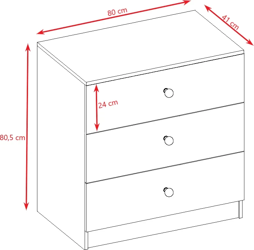 - Komoda posiada 3 pojemne szuflady na prowadnicach kulowych.