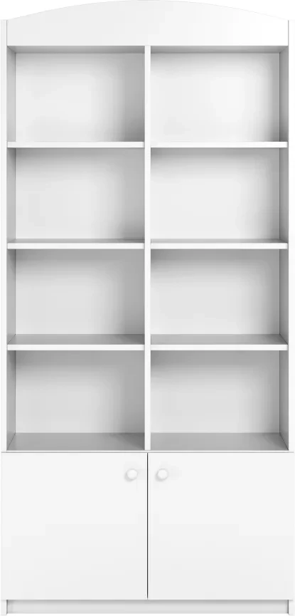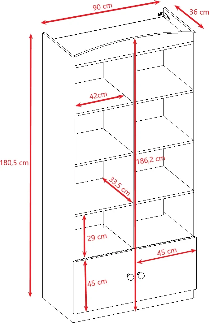 - Regał podwójny posiada 8 otwartych półek oraz 2 zamknięte za drzwiczkami półki.