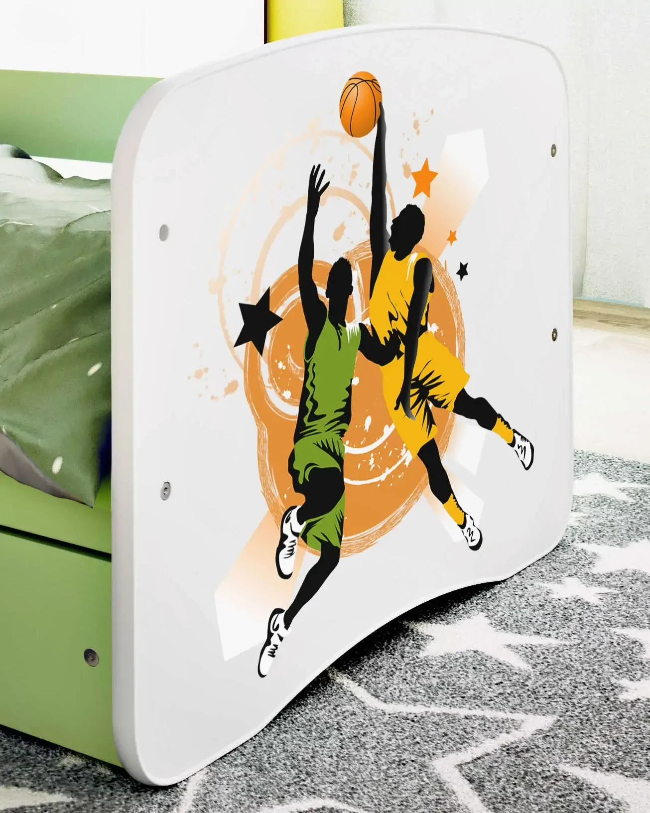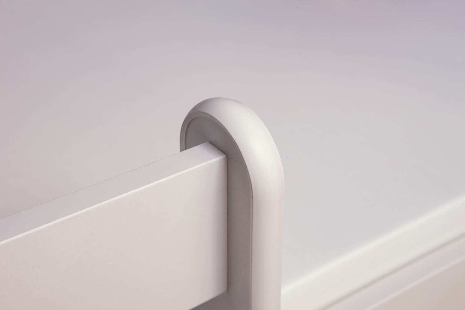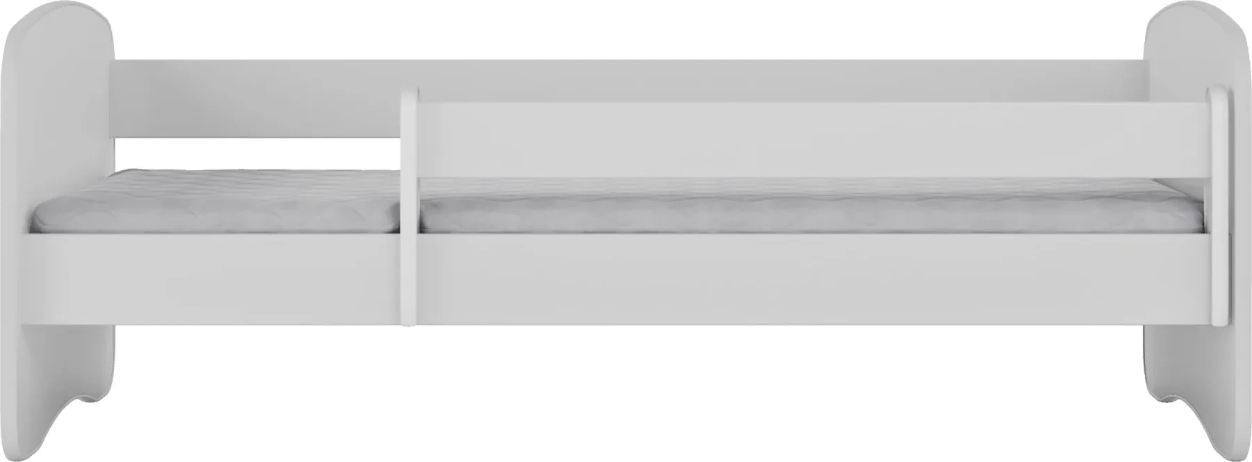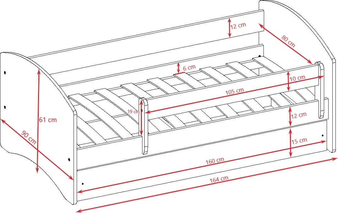 - Łóżko posiada przesuwną barierkę 100 cm, opcjonalną dwudzielną szufladę na pościel umieszczoną na gumowych kółkach z dodatkowo zabezpieczonymi krawędziami oraz 4 typy materacy do wyboru. Barierka, tak jak i szuflada, mogą zostać zamontowane po obu stronach mebla. Wykorzystanie grubych płyt oraz drewnianego stelażu pozwala na udźwig do 100 kg.