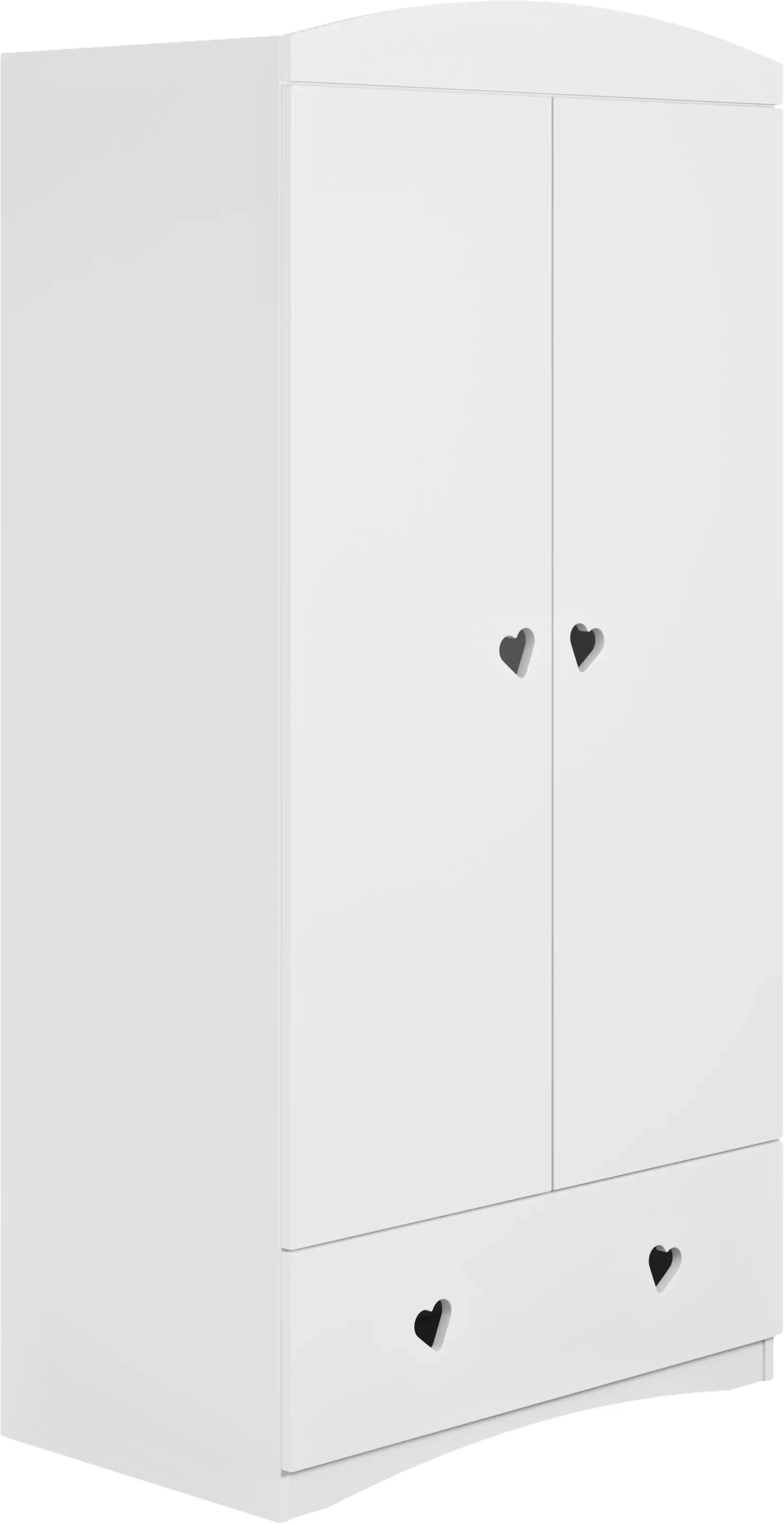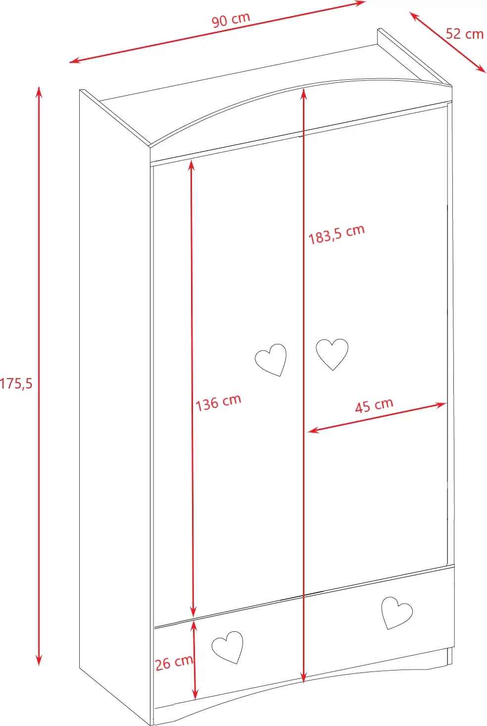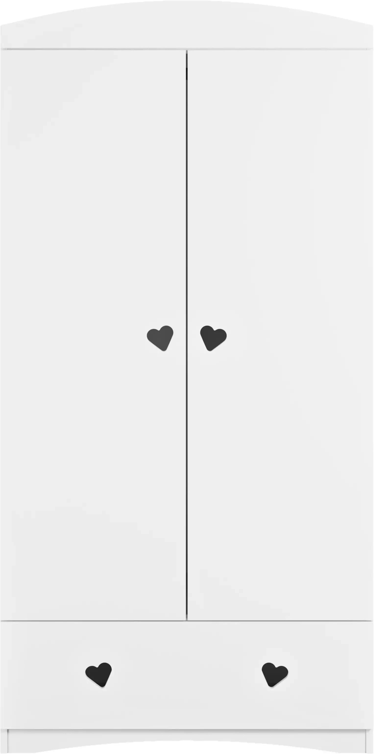 - Szafa dwudrzwiowa posiada pojemną szufladę osadzoną na prowadnicach kulkowych. Wewnątrz została podzielona na dwie części, z których jedna posiada drążek na wieszaki z odzieżą, a druga wyposażona jest w 4 półki.