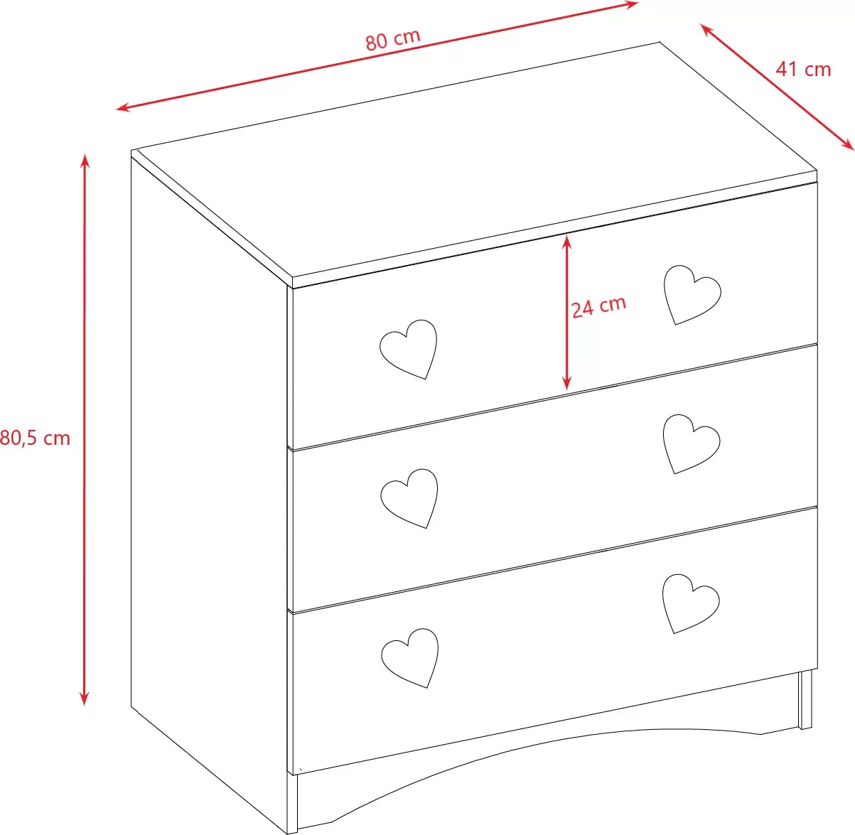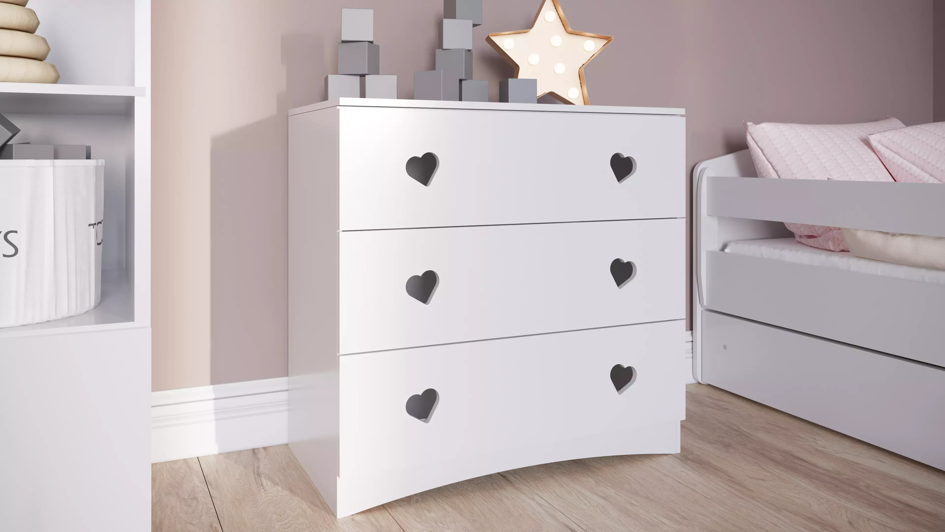 - Komoda posiada 3 pojemne szuflady o głębokości 34 cm osadzone na prowadnicach kulkowych.