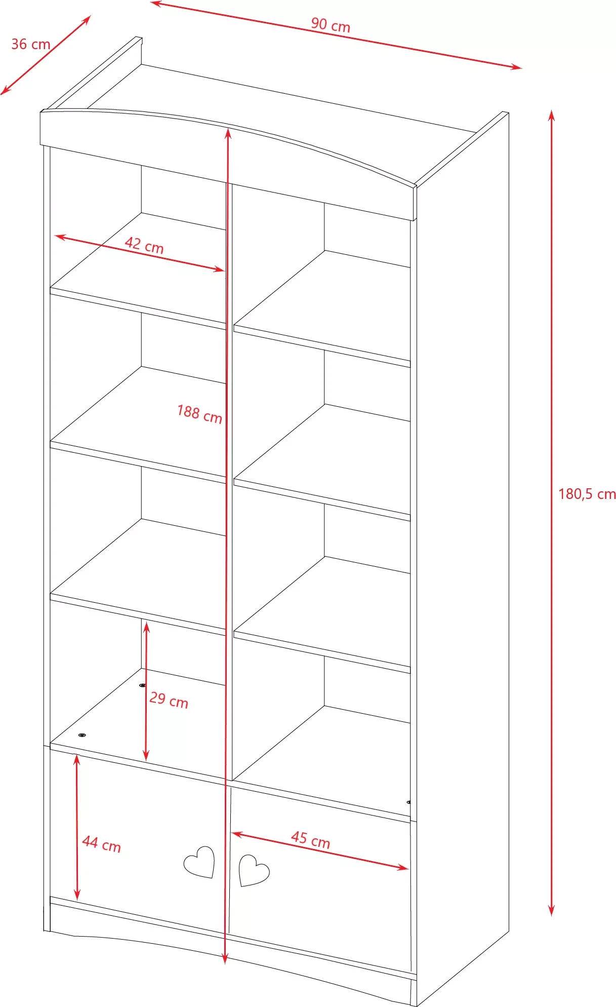 - Regał podwójny posiada 8 otwartych półek oraz 2 zamknięte za drzwiczkami półki.