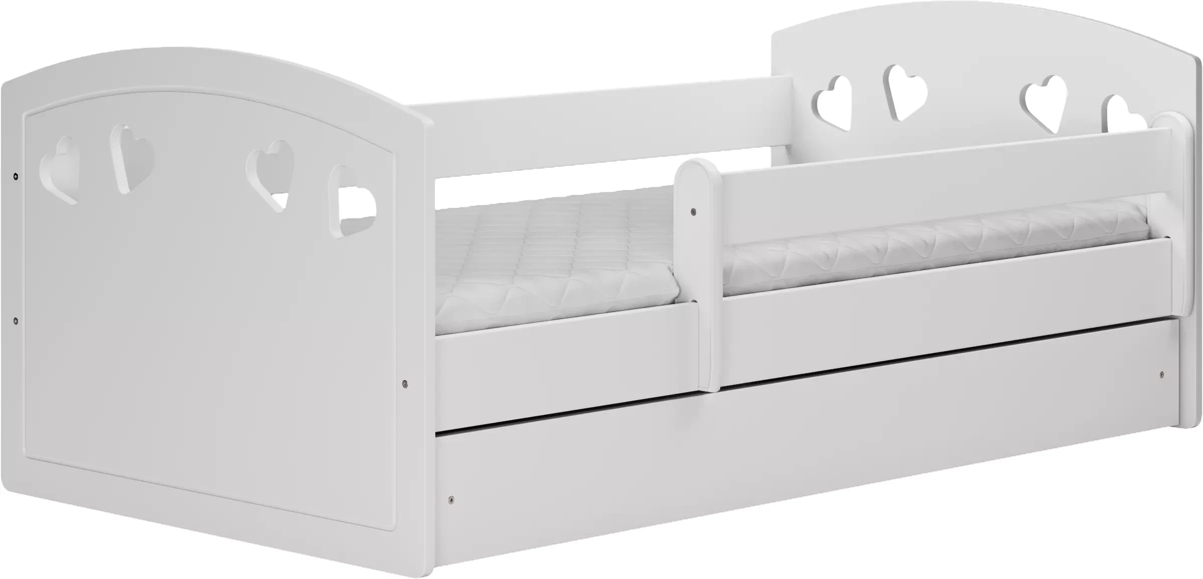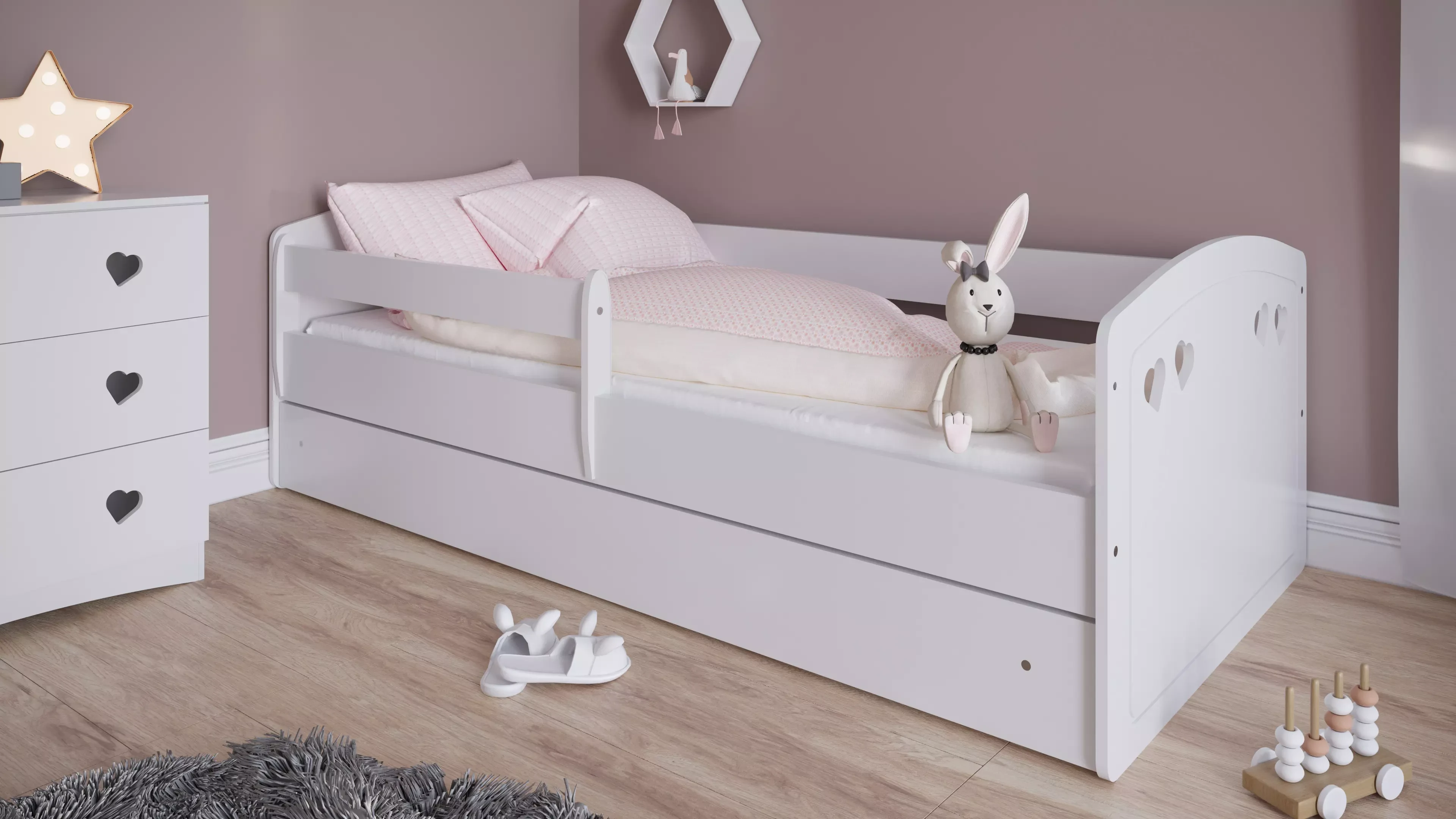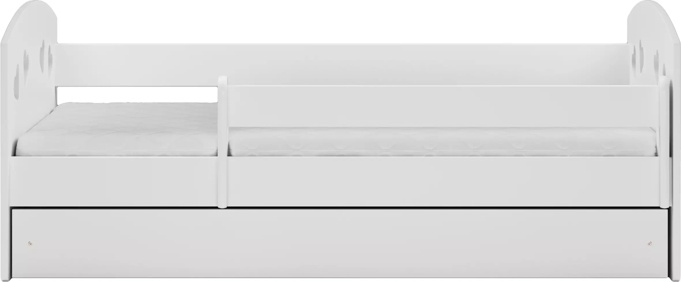 - Łóżko posiada przesuwną barierkę 100 cm, opcjonalną dwudzielną szufladę na pościel umieszczoną na gumowych kółkach z dodatkowo zabezpieczonymi krawędziami oraz 3 typy materacy do wyboru. Barierka, tak jak i szuflada, mogą zostać zamontowane po obu stronach mebla. Wykorzystanie grubych płyt oraz drewnianego stelażu pozwala na udźwig do 100 kg.