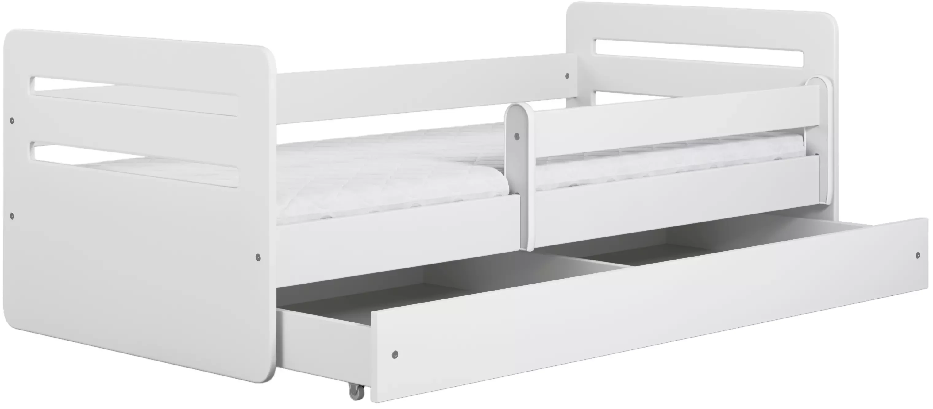 - Łóżko posiada przesuwną barierkę 100 cm, opcjonalną dwudzielną szufladę na pościel umieszczoną na gumowych kółkach z dodatkowo zabezpieczonymi krawędziami oraz 4 typy materacy do wyboru. Barierka, tak jak i szuflada, mogą zostać zamontowane po obu stronach mebla. Wykorzystanie grubych płyt oraz drewnianego stelażu pozwala na udźwig do 100 kg.