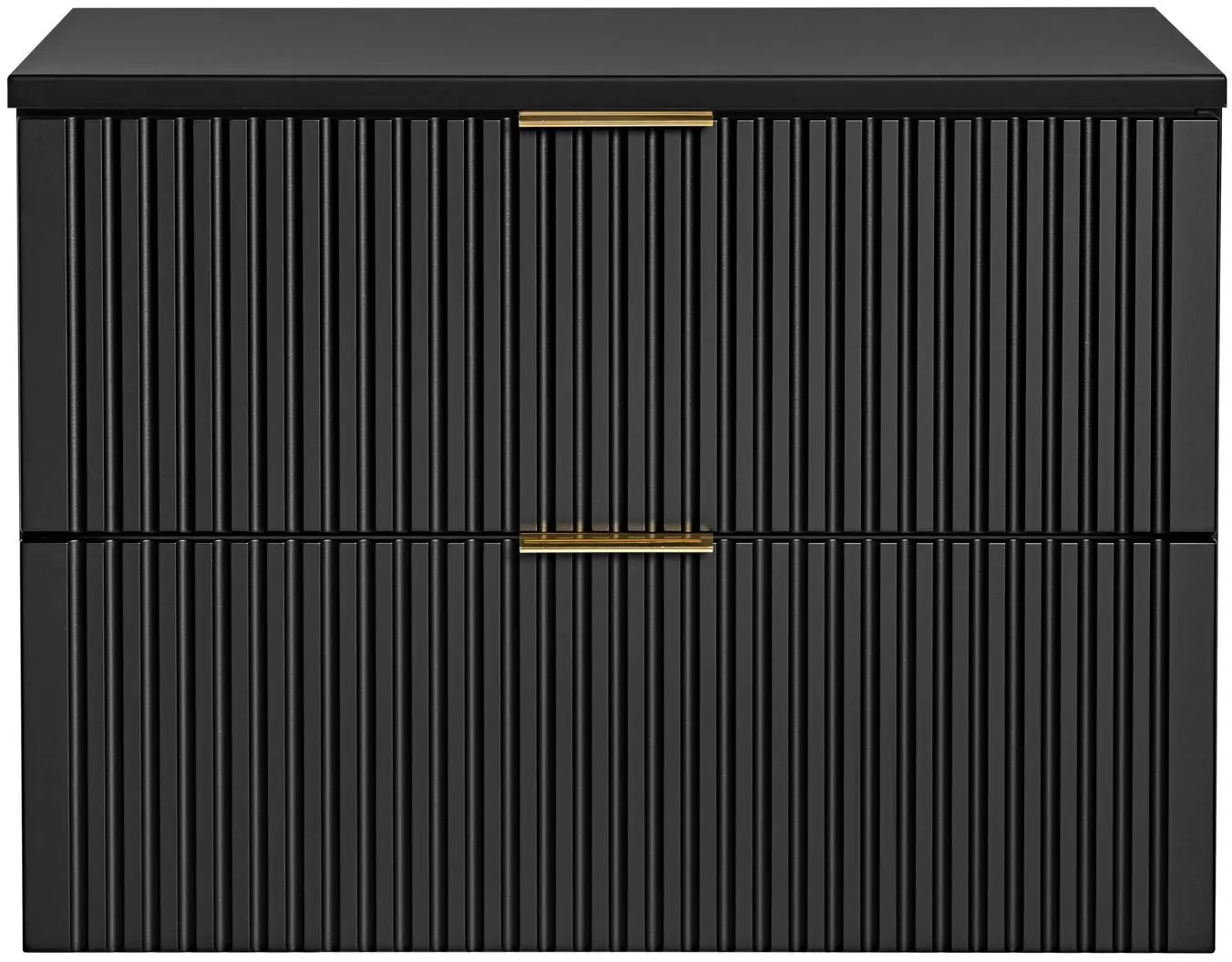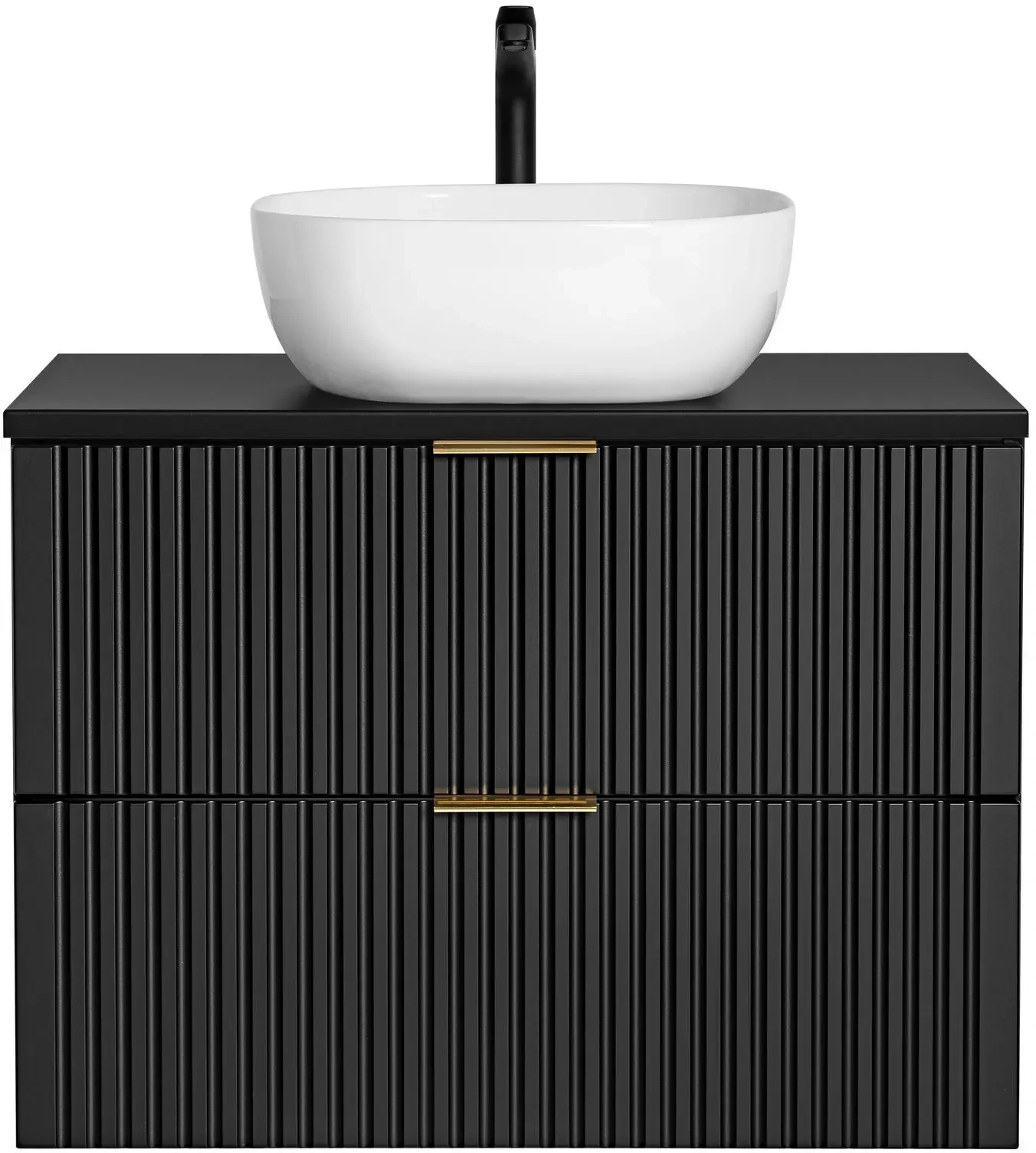 Szafka łazienkowa Adel Black o szerokości 80 cm, wyposażona w umywalkę nablatową Smile jest doskonałym rozwiązaniem dla nowoczesnych, eleganckich łazienek. Jej dwie pojemne szuflady zapewniają praktyczne miejsce do przechowywania, pomagając zachować porządek i estetykę. Korpus wykonany z laminowanej płyty oraz fronty z płyty MDF są nie tylko trwałe i łatwe w utrzymaniu, ale także dodają szafce eleganckiego wyglądu. Pionowe frezowania na frontach podkreślają nowoczesny design i wnoszą świeżość do wystroju łazienki. Wiszący typ montażu oszczędza miejsce i ułatwia czyszczenie. Dodatkowym atutem są trzy kolory uchwytów dołączone do zestawu (złoty połysk, chrom połysk oraz czarny mat), co pozwala na personalizację wyglądu szafki zgodnie z indywidualnymi preferencjami. Ponadczasowe wzornictwo szafki Adel Black łączy się z dostępnością kompatybilnych mebli z tej samej kolekcji, umożliwiając stworzenie spójnego i stylowego zestawu, który będzie służyć przez lata.