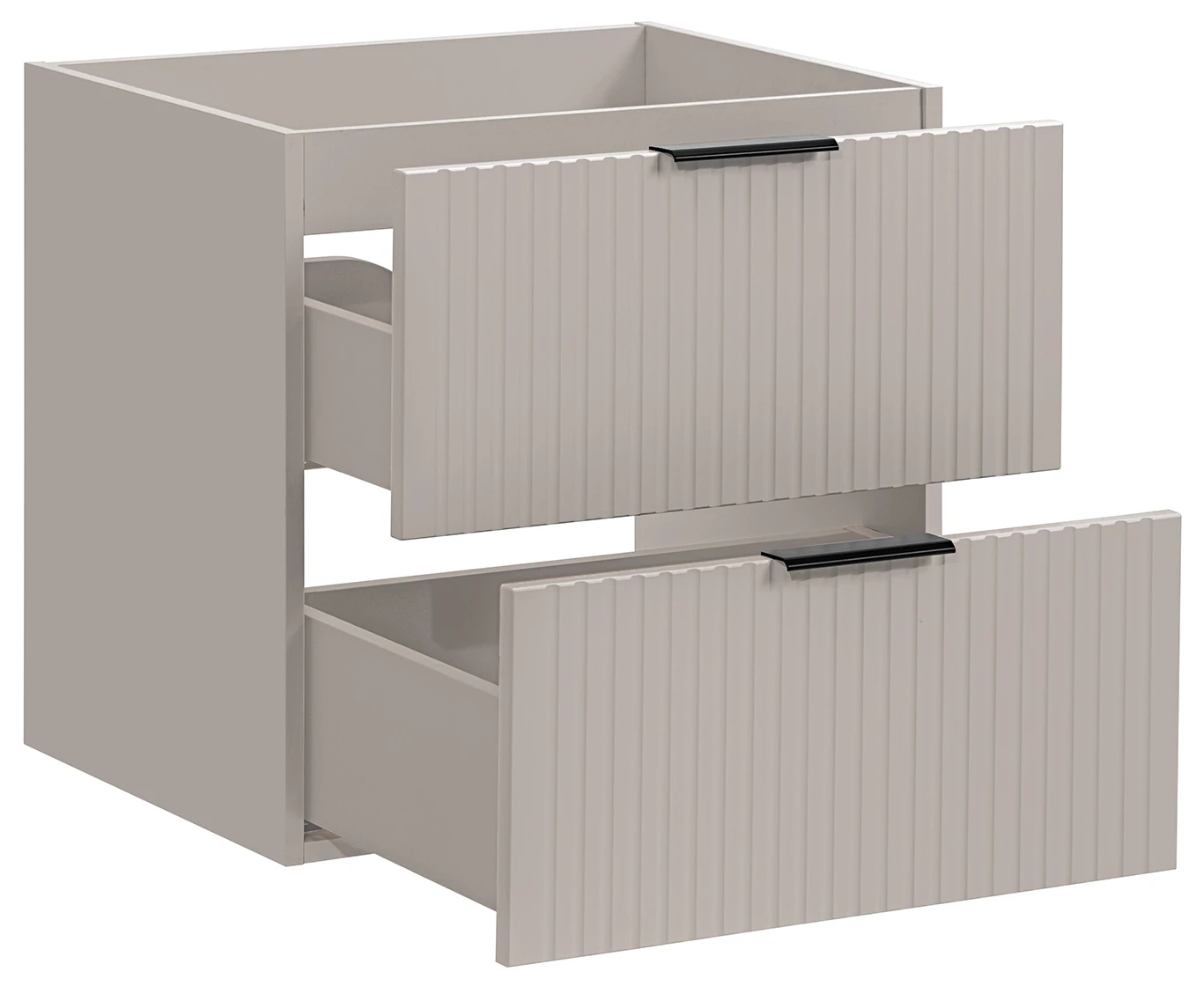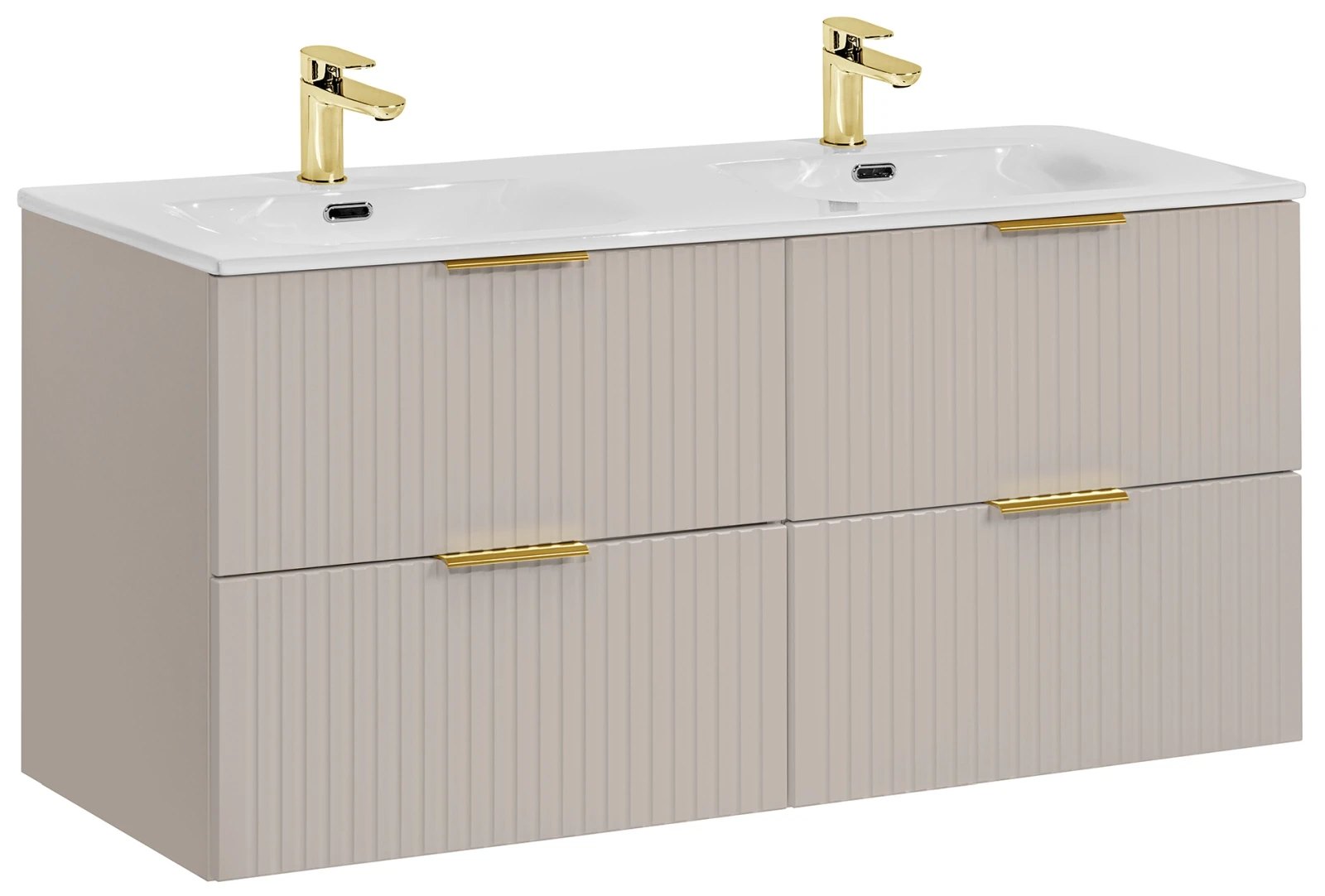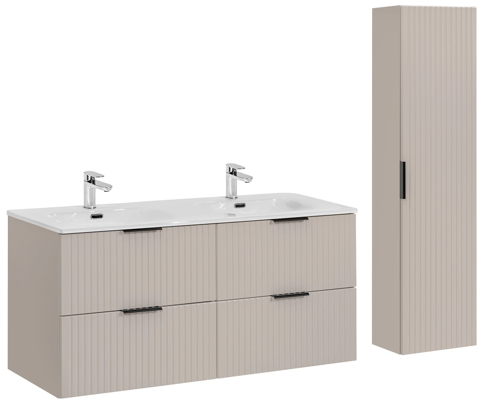 Trzyelementowy zestaw mebli łazienkowych Adel Cashmere to doskonałe rozwiązanie dla nowoczesnych, eleganckich łazienek. W skład zestawu wchodzą dwie szafki pod umywalkę o szerokości 60 cm oraz podwójna, ceramiczna umywalka meblowa Sky. Każda szafka wyposażona została w dwie pojemne szuflady, które zapewniają praktyczne miejsce do przechowywania, pomagając zachować porządek i estetykę. Korpus wykonany z laminowanej płyty oraz fronty z płyty MDF są nie tylko trwałe i łatwe w utrzymaniu, ale także dodają szafce eleganckiego wyglądu. Pionowe frezowania na frontach podkreślają nowoczesny design i wnoszą świeżość do wystroju łazienki. Wiszący typ montażu oszczędza miejsce i ułatwia czyszczenie. Dodatkowym atutem są trzy kolory uchwytów dołączone do zestawu (złoty połysk, chrom połysk oraz czarny mat), co pozwala na personalizację wyglądu szafki zgodnie z indywidualnymi preferencjami. Ponadczasowe wzornictwo szafki Adel Cashmere łączy się z dostępnością kompatybilnych mebli z tej samej kolekcji, umożliwiając stworzenie spójnego i stylowego zestawu, który będzie służyć przez lata.