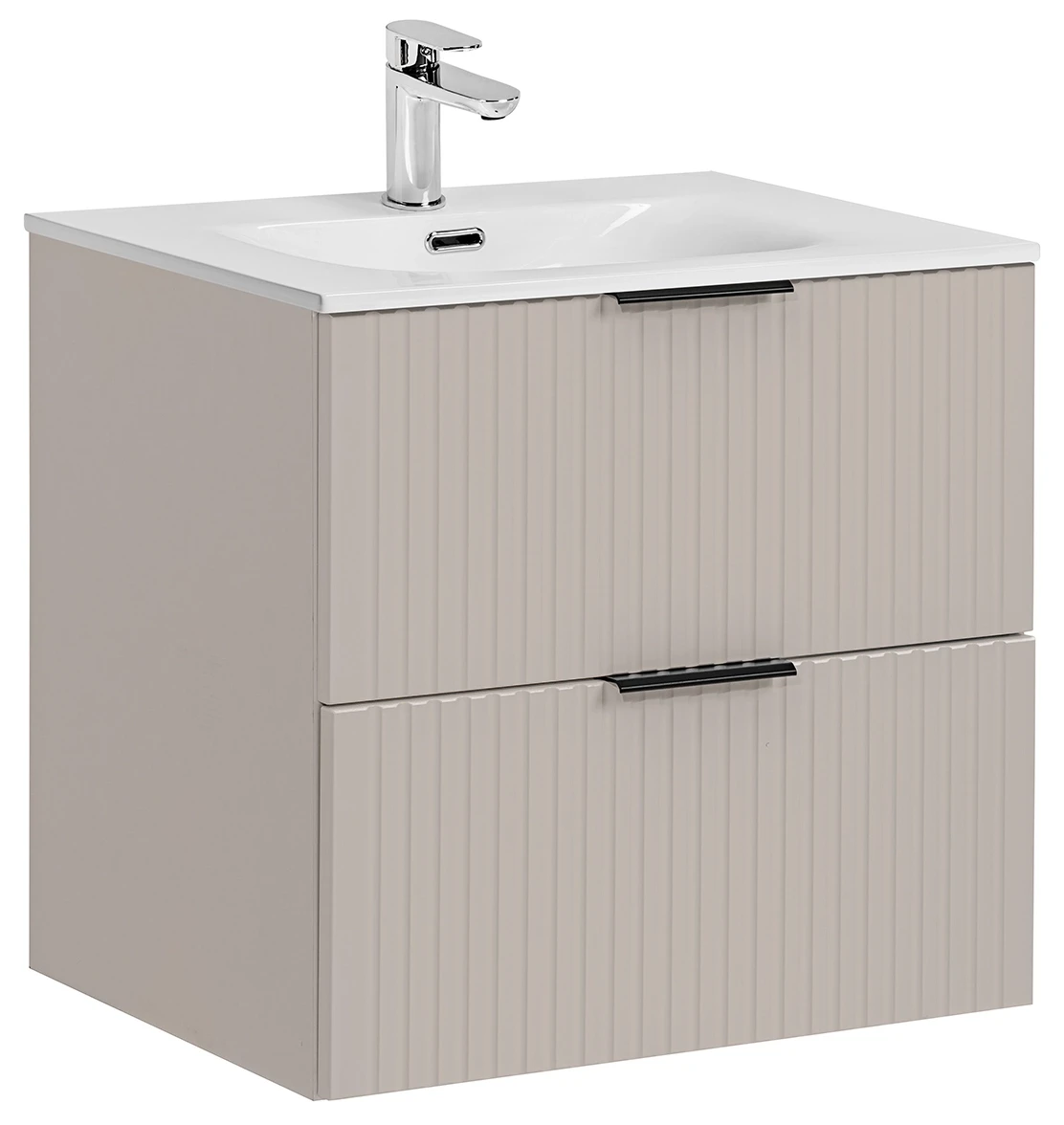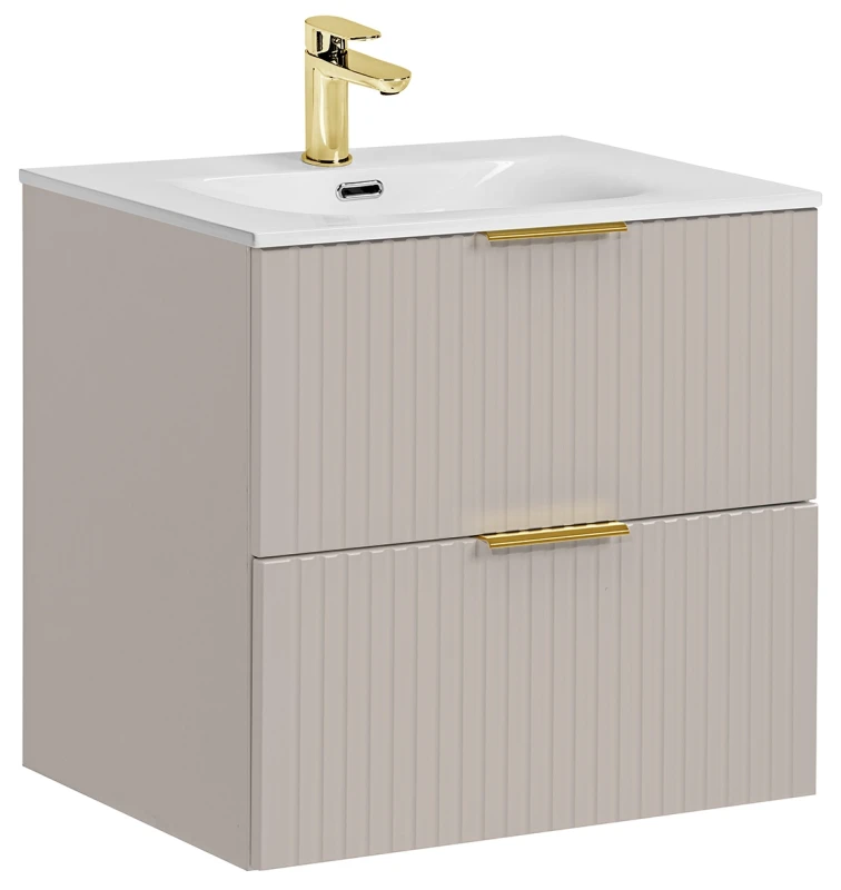 Szafka łazienkowa Adel Cashmere o szerokości 60 cm, wyposażona w umywalkę Sky jest doskonałym rozwiązaniem dla nowoczesnych, eleganckich łazienek. Jej dwie pojemne szuflady zapewniają praktyczne miejsce do przechowywania, pomagając zachować porządek i estetykę. Korpus wykonany z laminowanej płyty oraz fronty z płyty MDF są nie tylko trwałe i łatwe w utrzymaniu, ale także dodają szafce eleganckiego wyglądu. Pionowe frezowania na frontach podkreślają nowoczesny design i wnoszą świeżość do wystroju łazienki. Wiszący typ montażu oszczędza miejsce i ułatwia czyszczenie. Dodatkowym atutem są trzy kolory uchwytów dołączone do zestawu (złoty połysk, chrom połysk oraz czarny mat), co pozwala na personalizację wyglądu szafki zgodnie z indywidualnymi preferencjami. Ponadczasowe wzornictwo szafki Adel Cashmere łączy się z dostępnością kompatybilnych mebli z tej samej kolekcji, umożliwiając stworzenie spójnego i stylowego zestawu, który będzie służyć przez lata.