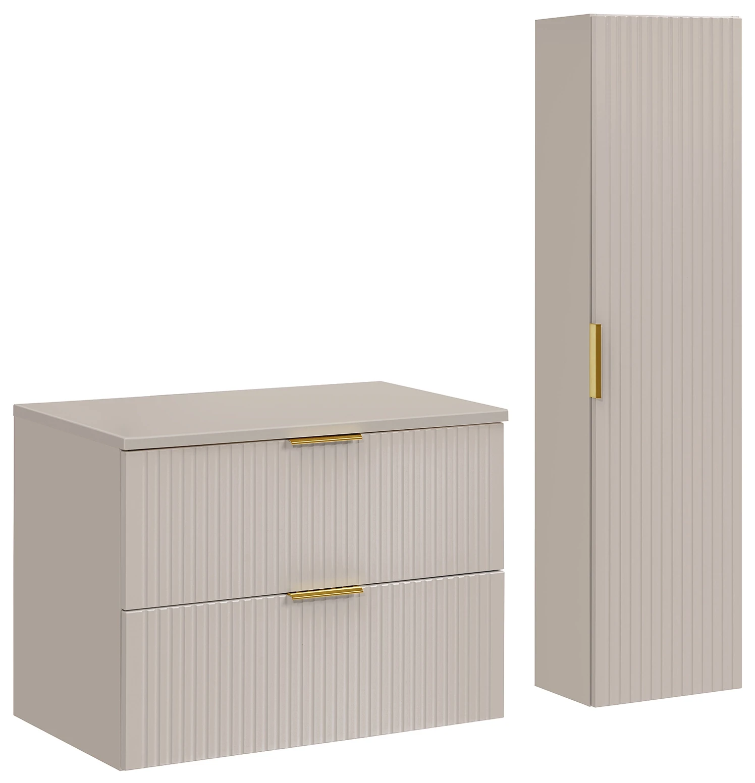 Szafka łazienkowa z blatem Adel Cashmere to doskonałe rozwiązanie dla nowoczesnych, eleganckich łazienek. Szafka wyposażona została w dwie pojemne szuflady, które zapewniają praktyczne miejsce do przechowywania, pomagając zachować porządek i estetykę. Korpus wykonany z laminowanej płyty oraz fronty z płyty MDF są nie tylko trwałe i łatwe w utrzymaniu, ale także dodają szafce eleganckiego wyglądu. Pionowe frezowania na frontach podkreślają nowoczesny design i wnoszą świeżość do wystroju łazienki. Wiszący typ montażu oszczędza miejsce i ułatwia czyszczenie. Dodatkowym atutem są trzy kolory uchwytów dołączone do zestawu (złoty połysk, chrom połysk oraz czarny mat), co pozwala na personalizację wyglądu szafki zgodnie z indywidualnymi preferencjami. Ponadczasowe wzornictwo szafki Adel Cashmere łączy się z dostępnością kompatybilnych mebli z tej samej kolekcji, umożliwiając stworzenie spójnego i stylowego zestawu, który będzie służyć przez lata.