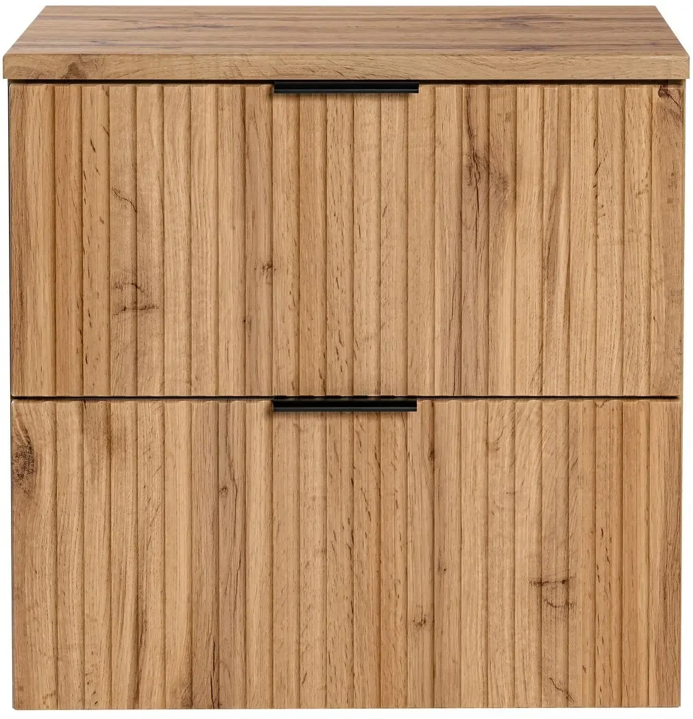 Szafka pod umywalkę Adel Oak o szerokości 60 cm, wyposażona w blat w kolorze dąb wotan jest doskonałym rozwiązaniem dla nowoczesnych, eleganckich łazienek. Jej dwie pojemne szuflady zapewniają praktyczne miejsce do przechowywania, pomagając zachować porządek i estetykę. Korpus wykonany z laminowanej płyty oraz fronty z płyty MDF są nie tylko trwałe i łatwe w utrzymaniu, ale także dodają szafce eleganckiego wyglądu. Pionowe frezowania na frontach podkreślają nowoczesny design i wnoszą świeżość do wystroju łazienki. Wiszący typ montażu oszczędza miejsce i ułatwia czyszczenie. Dodatkowym atutem są trzy kolory uchwytów dołączone do zestawu (złoty połysk, chrom połysk oraz czarny mat), co pozwala na personalizację wyglądu szafki zgodnie z indywidualnymi preferencjami. Ponadczasowe wzornictwo szafki Adel Oak łączy się z dostępnością kompatybilnych mebli z tej samej kolekcji, umożliwiając stworzenie spójnego i stylowego zestawu, który będzie służyć przez lata.