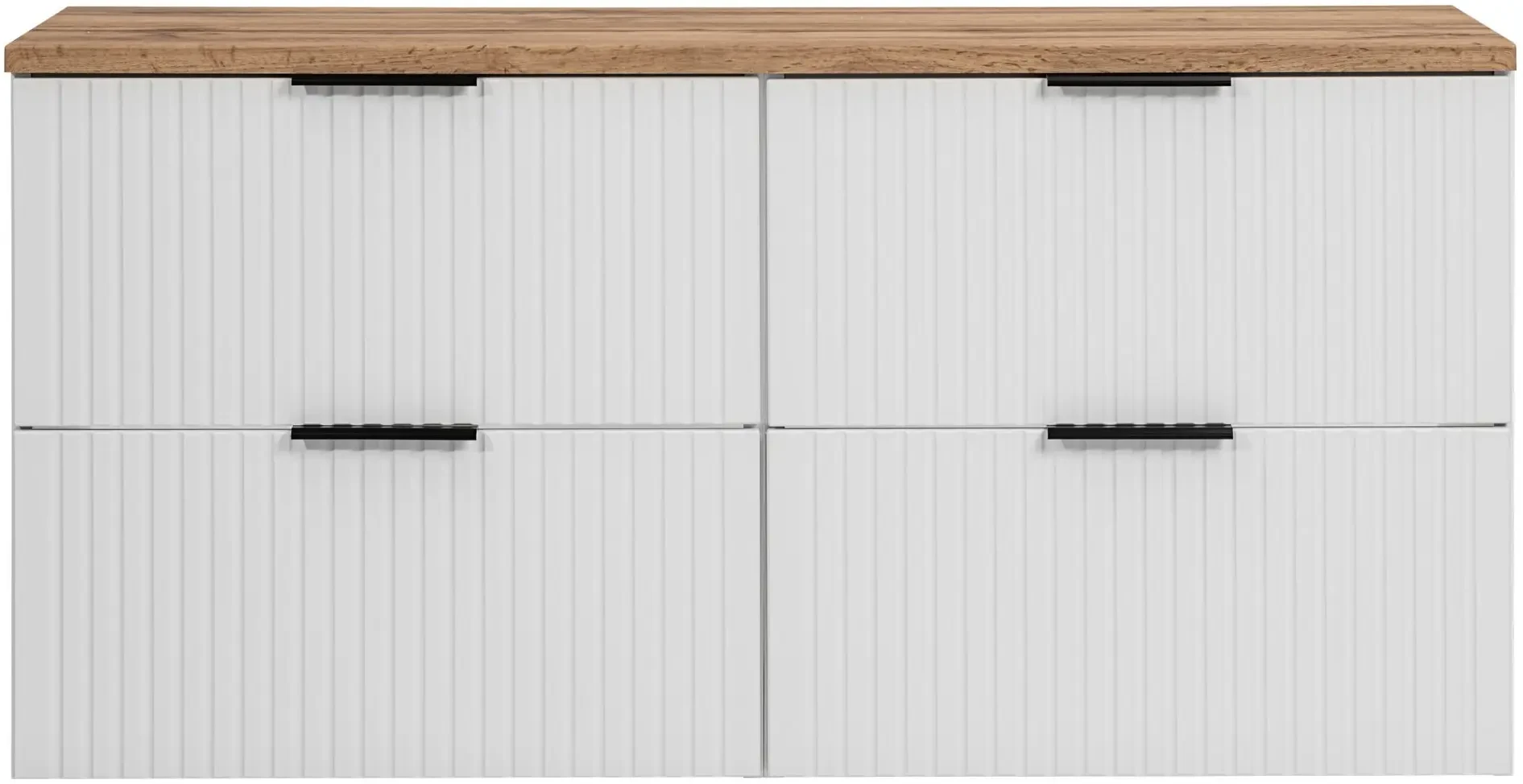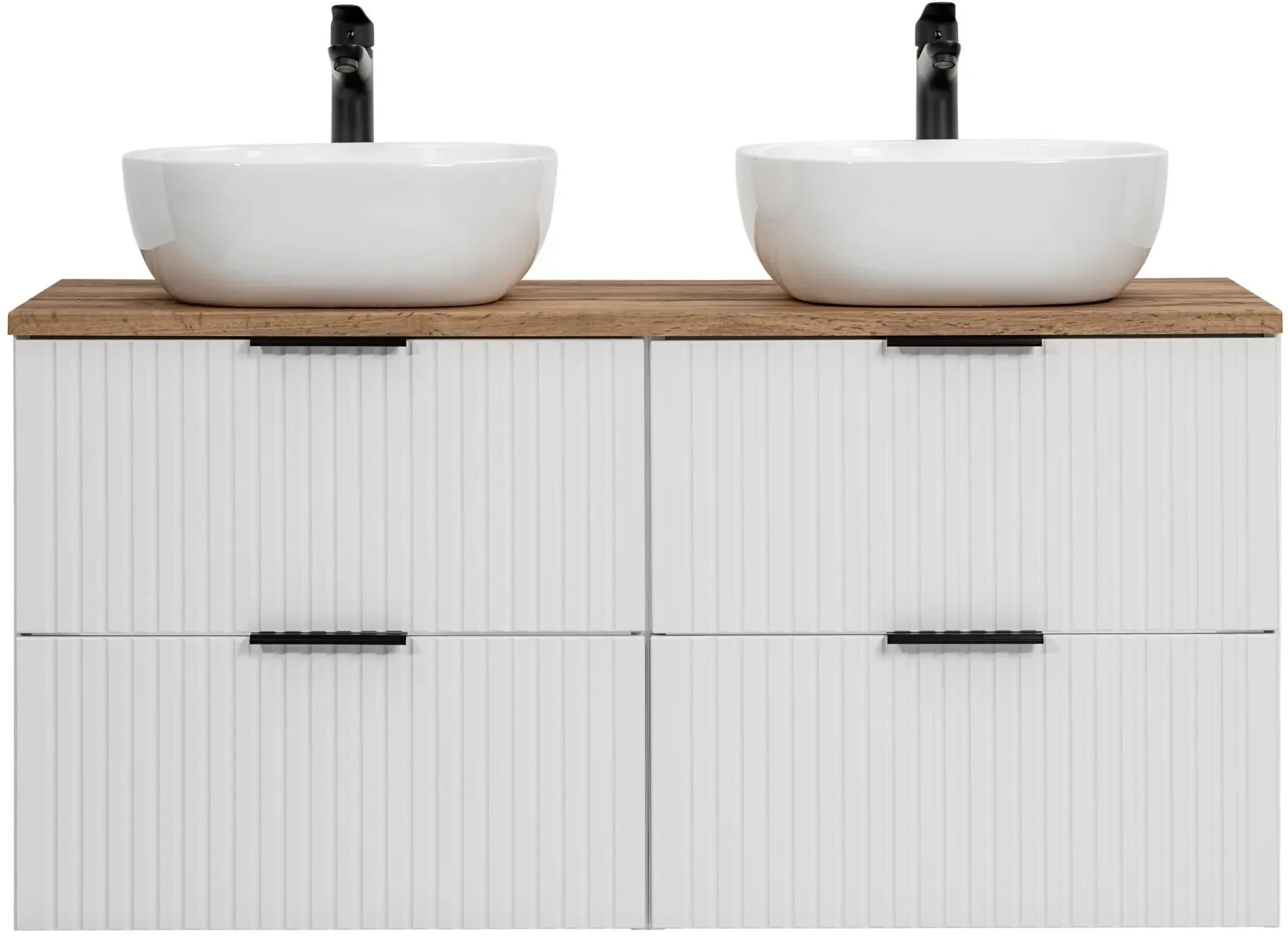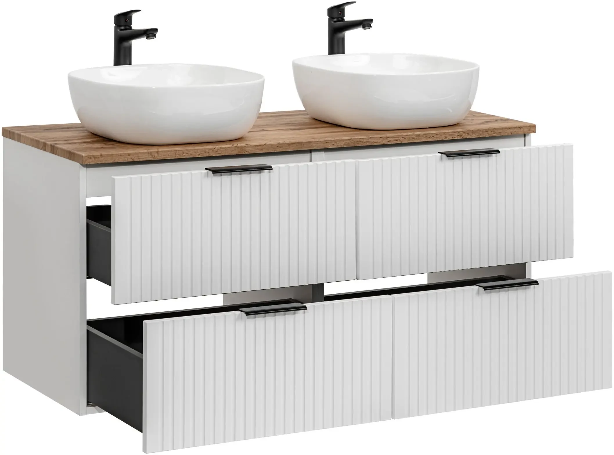 Pięcioelementowy zestaw mebli łazienkowych Adel White to doskonałe rozwiązanie dla nowoczesnych, eleganckich łazienek. W skład zestawu wchodzą dwie szafki pod umywalkę o szerokości 60 cm każda, dwie umywalki nablatowe oraz piękny blat w kolorze dąb wotan. Każda szafka wyposażona została w dwie pojemne szuflady, które zapewniają praktyczne miejsce do przechowywania, pomagając zachować porządek i estetykę. Korpus wykonany z laminowanej płyty oraz fronty z płyty MDF są nie tylko trwałe i łatwe w utrzymaniu, ale także dodają szafce eleganckiego wyglądu. Pionowe frezowania na frontach podkreślają nowoczesny design i wnoszą świeżość do wystroju łazienki. Wiszący typ montażu oszczędza miejsce i ułatwia czyszczenie. Dodatkowym atutem są trzy kolory uchwytów dołączone do zestawu (złoty połysk, chrom połysk oraz czarny mat), co pozwala na personalizację wyglądu szafki zgodnie z indywidualnymi preferencjami. Ponadczasowe wzornictwo szafki Adel White łączy się z dostępnością kompatybilnych mebli z tej samej kolekcji, umożliwiając stworzenie spójnego i stylowego zestawu, który będzie służyć przez lata.