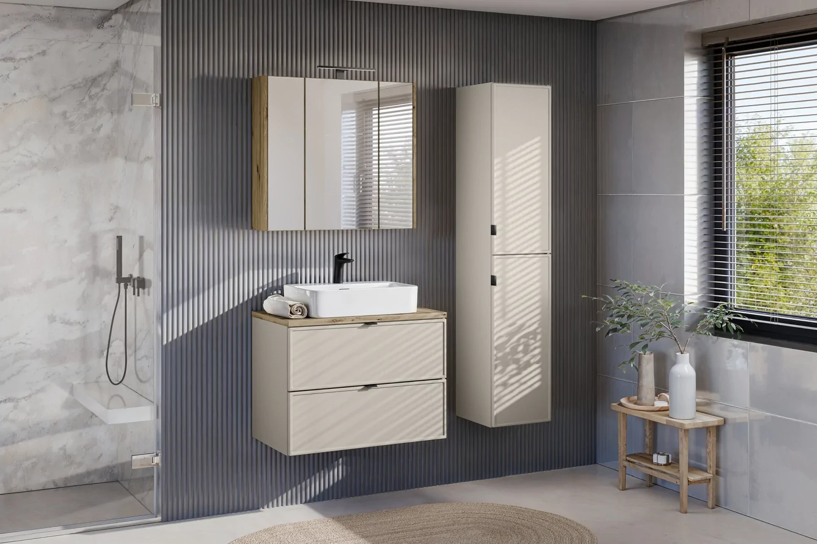 - Elegancja i styl: Kaszmirowy matowy kolor oraz frezowane fronty nadają zestawowi luksusowy charakter, który z łatwością wkomponuje się w nowoczesne łazienki.