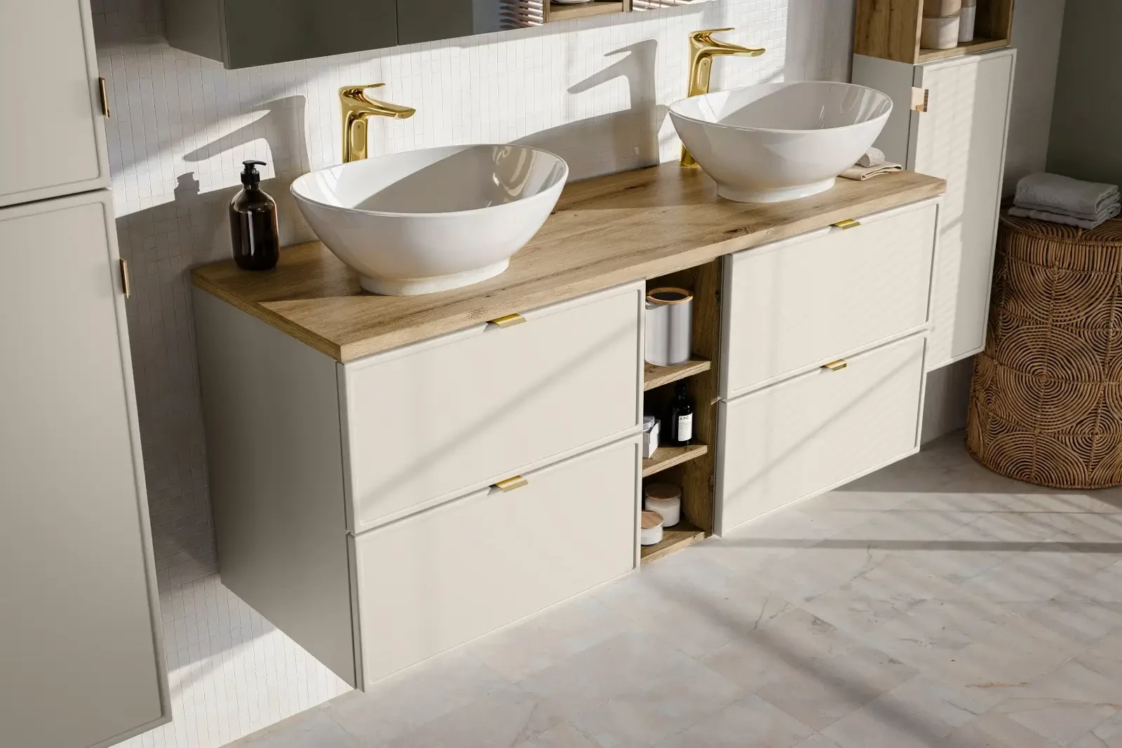 - Elegancja i styl: Delikatne połączenie kaszmirowego matu z frezowanymi frontami oraz naturalnym wyglądem dębu artisan nadaje łazience wyjątkowy charakter, łącząc nowoczesność z ponadczasowym stylem.