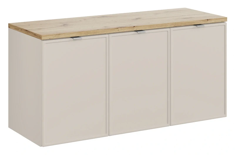 Blat o szerokości 120 cm w kolorze dąb artisan nadaje wnętrzu przytulnego, naturalnego charakteru, idealnie komponując się z matowymi, kaszmirowymi frontami szafki. Szafka pod umywalkę wyposażona w trzy drzwi zapewnia wygodną przestrzeń do przechowywania niezbędnych akcesoriów łazienkowych, kosmetyków czy ręczników. Frezowany wzór frontów podkreśla elegancki styl mebli, dodając im wyrafinowanego charakteru.