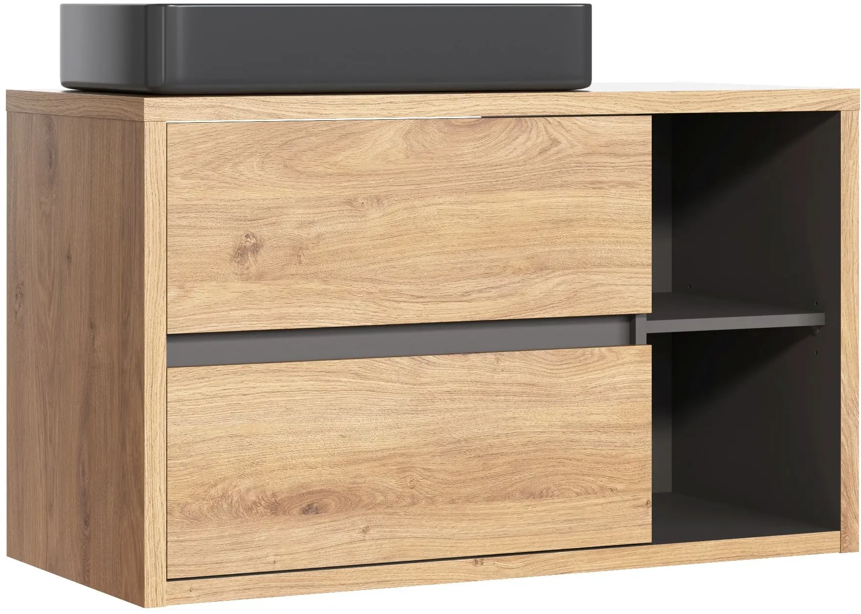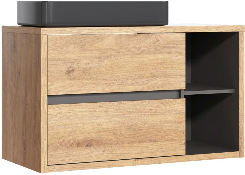 Szafka łazienkowa z kolekcji DEVON to elegancki i funkcjonalny mebel do każdej łazienki. Szafka wyposażona została w dwie pojemne szuflady i dwie otwarte półki, zapewniając przestrzeń na wszystkie niezbędne łazienkowe akcesoria. W zestawie znajduje się również umywalka, co dodatkowo podnosi funkcjonalność mebla. Wisząca konstrukcja pozwala na łatwe utrzymanie porządku i czystości pod meblem. Szafka wykonana została z wytrzymałej płyty laminowanej w stylowym połączeniu kolorów dąb shetland i grafit, co nadaje jej nowoczesnego charakteru. Prosty, ale elegancki design harmonijnie wpisuje się w różnorodne aranżacje łazienkowe. Ponadto, istnieje możliwość rozbudowy zestawu o inne meble z kolekcji DEVON, co pozwala na stworzenie spójnej i funkcjonalnej przestrzeni.