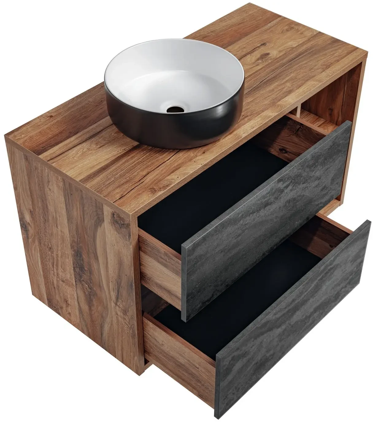 Szafka łazienkowa HAMPTON CONCRETE to doskonały wybór dla miłośników nowoczesnych, ale jednocześnie niestandardowych aranżacji. Półki oraz dwie szuflady zapewnią wystarczająco dużo miejsca do przechowywania niezbędnych akcesoriów łazienkowych. Wisząca konstrukcja nie tylko ułatwi utrzymanie porządku i czystości, ale także doda wnętrzu lekkości i nowoczesnego charakteru. Półki oraz dwie szuflady zapewnią wystarczająco dużo miejsca do przechowywania niezbędnych akcesoriów łazienkowych. Szafka wykonana została z wytrzymałej płyty laminowanej i MDF, co gwarantuje ich długą żywotność i odporność na wilgoć. Betonowe fronty połączone z korpusem w kolorze dębu Hunton tworzą unikalne połączenie, które doskonale wpisuje się w surowy styl loftu, jednocześnie nadając mu cieplejszy, bardziej domowy charakter. Taki wybór materiałów przyciąga uwagę kontrastem między chłodnym, industrialnym betonem a ciepłą, naturalną teksturą dębu. Cichy domyk to dodatkowy atut, podnoszący komfort i odporność na różnorodne warunki użytkowania.