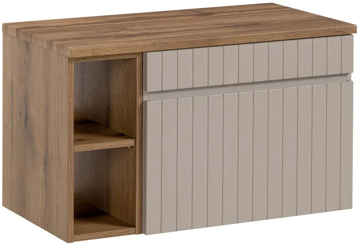 Zestaw mebli łazienkowych ICONIC CASHMERE to klasyczne i eleganckie rozwiązanie do Twojej łazienki. Ten trzyelementowy zestaw zawiera szafkę pod umywalkę o szerokości 60 cm, otwarty regał z półkami oraz piękny blat w kolorze dąb coast evoke. Szafka 60 cm wyposażona została w pojemną szufladę, co zapewnia dużo miejsca do przechowywania i wygodę użytkowania. Wisząca konstrukcja sprawia, że szafka jest nie tylko funkcjonalna, ale również dodaje przestrzeni i lekkości wnętrzu. W kolekcji mebli z tej serii zostały wykorzystane pionowe frezowania. Ryflowanie, to szczególnie atrakcyjny i wszechstronny efekt wzorniczy wprowadzający ruch i płynność do każdego wnętrza łazienki. Podwójna szafka ICONIC CASHMERE łączy w sobie wysoką jakość wykonania z pięknym wzornictwem, idealnie pasując do nowoczesnych łazienek, które cenią sobie zarówno estetykę, jak i funkcjonalność.