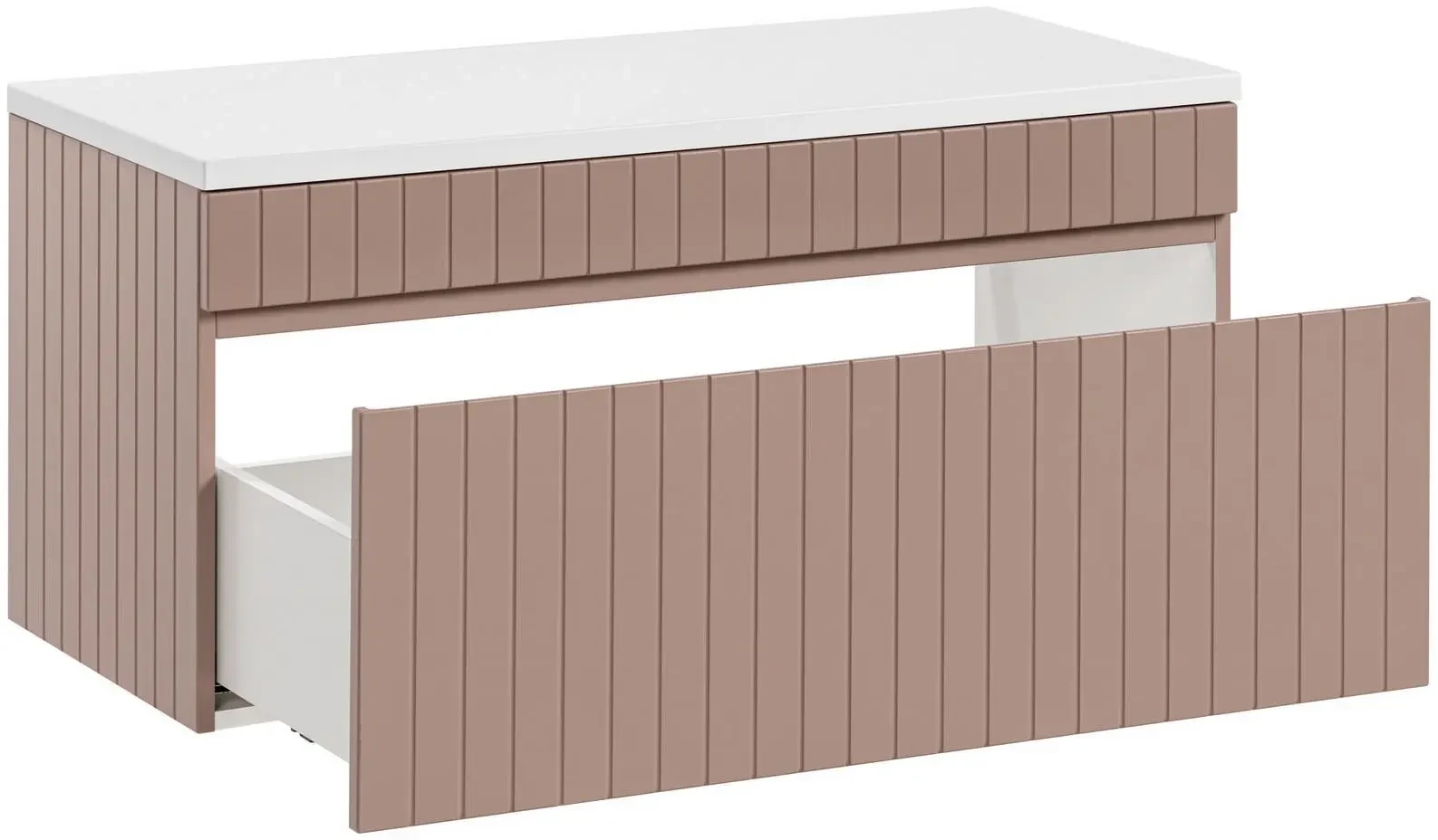 Szafka z blatem Iconic ROSE, to unikalny mebel do łazienki. Szafka Iconic ROSE została wyposażona w pojemną szufladę, która pomieści sporo kosmetyków lub innych akcesoriów łazienkowych oraz blat w kolorze białym. W kolekcji mebli z tej serii zostały wykorzystane pionowe frezowania we frontach i korpusie. Ryflowanie, to szczególnie atrakcyjny i wszechstronny efekt wzorniczy wprowadzający ruch i płynność do każdego wnętrza łazienki. Nowoczesna kolorystyka jest naszą odpowiedzią na zmieniające się trendy oraz potrzeby wizualne klientów, które stają się coraz bardziej wyszukane. Kolekcja jest modułowa, co daje możliwość tworzenia zestawów odpowiednich do łazienek w każdym rozmiarze. W skład kolekcji wchodzą, szafki pod umywalkę w trzech rozmiarach – 60cm, 80cm oraz 100cm, a także słupek wysoki.