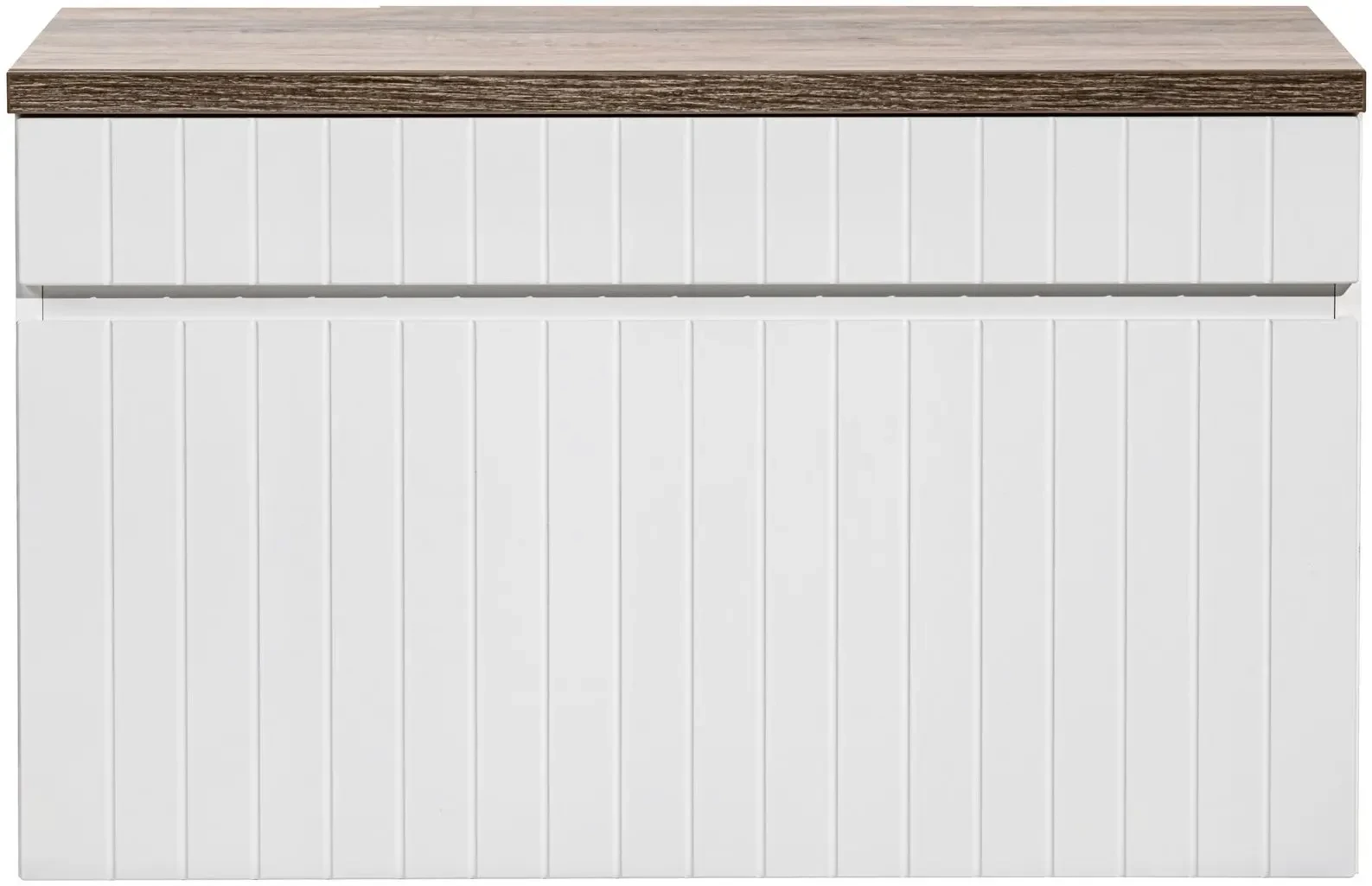 Szafka z blatem Iconic White, to unikalny mebel do łazienki. Szafka Iconic White została wyposażona w pojemną szufladę, która pomieści sporo kosmetyków lub innych akcesoriów łazienkowych oraz piękny blat w kolorze dąb santa fe vintage. W kolekcji mebli z tej serii zostały wykorzystane pionowe frezowania we frontach i korpusie. Ryflowanie, to szczególnie atrakcyjny i wszechstronny efekt wzorniczy wprowadzający ruch i płynność do każdego wnętrza łazienki. Nowoczesna kolorystyka jest naszą odpowiedzią na zmieniające się trendy oraz potrzeby wizualne klientów, które stają się coraz bardziej wyszukane. Kolekcja jest modułowa, co daje możliwość tworzenia zestawów odpowiednich do łazienek w każdym rozmiarze. W skład kolekcji wchodzą, szafki pod umywalkę w trzech rozmiarach – 60cm, 80cm oraz 100cm, a także słupek wysoki.