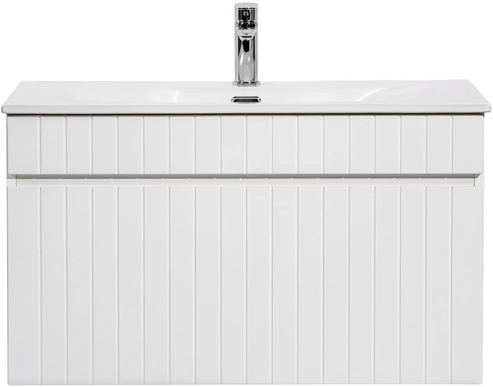 Szafka z umywalką Iconic White, to unikalny mebel do łazienki. Szafka Iconic White została wyposażona w pojemną szufladę, która pomieści sporo kosmetyków lub innych akcesoriów łazienkowych oraz ceramiczną umywalkę SKY 80/DP-8099. W kolekcji mebli z tej serii zostały wykorzystane pionowe frezowania we frontach i korpusie. Ryflowanie, to szczególnie atrakcyjny i wszechstronny efekt wzorniczy wprowadzający ruch i płynność do każdego wnętrza łazienki. Nowoczesna kolorystyka jest naszą odpowiedzią na zmieniające się trendy oraz potrzeby wizualne klientów, które stają się coraz bardziej wyszukane. Kolekcja jest modułowa, co daje możliwość tworzenia zestawów odpowiednich do łazienek w każdym rozmiarze. W skład kolekcji wchodzą, szafki pod umywalkę w trzech rozmiarach – 60cm, 80cm oraz 100cm, a także słupek wysoki.