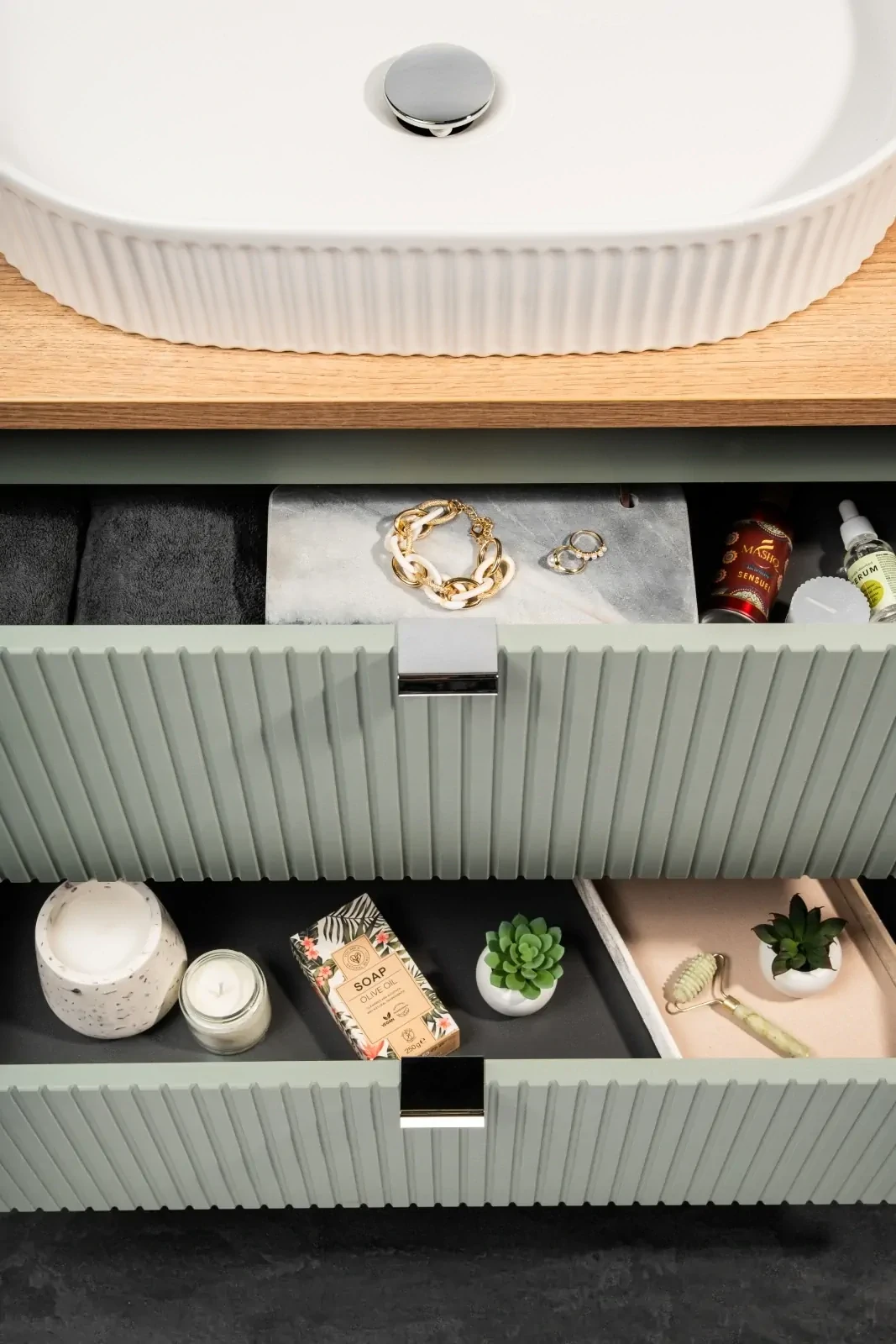 Zestaw mebli łazienkowych LINE REED GREEN oferuje wiele korzyści, które sprawiają, że jest to doskonały wybór dla nowoczesnej łazienki. Przemyślany design, łączący elegancki kolor szałwiowy z ciepłym odcieniem dębu, co nadaje wnętrzu przytulny i estetyczny wygląd. Dodatkowo, zestaw zawiera dwie funkcjonalne szuflady, które pozwalają na łatwe przechowywanie różnorodnych przedmiotów codziennego użytku, zapewniając porządek i organizację przestrzeni. Nowoczesny charakter zestawu podkreślają pionowe ryflowania na frontach, które dodają minimalistycznego stylu, czyniąc meble wyjątkowym dodatkiem do każdej łazienki. Ciche domyk gwarantuje komfort użytkowania bez zakłócania spokoju, co jest szczególnie ważne w miejscu odpoczynku, jakim jest łazienka. Zastosowanie wysokiej jakości materiałów zapewnia trwałość i odporność mebli na działanie wilgoci, co jest kluczowe w warunkach łazienkowych. Zestaw mebli łazienkowych LINE REED GREEN to nie tylko piękno i nowoczesność, ale także funkcjonalność i komfort użytkowania, co czyni go atrakcyjnym i praktycznym elementem wyposażenia każdej łazienki.
