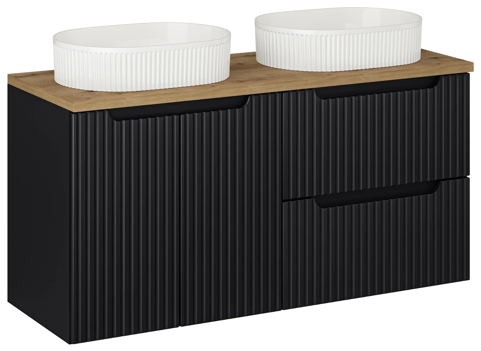 Zestaw mebli łazienkowych NOVA BLACK z dwoma umywalkami BEYOND i blatem dąb 120 cm - 5 elementów