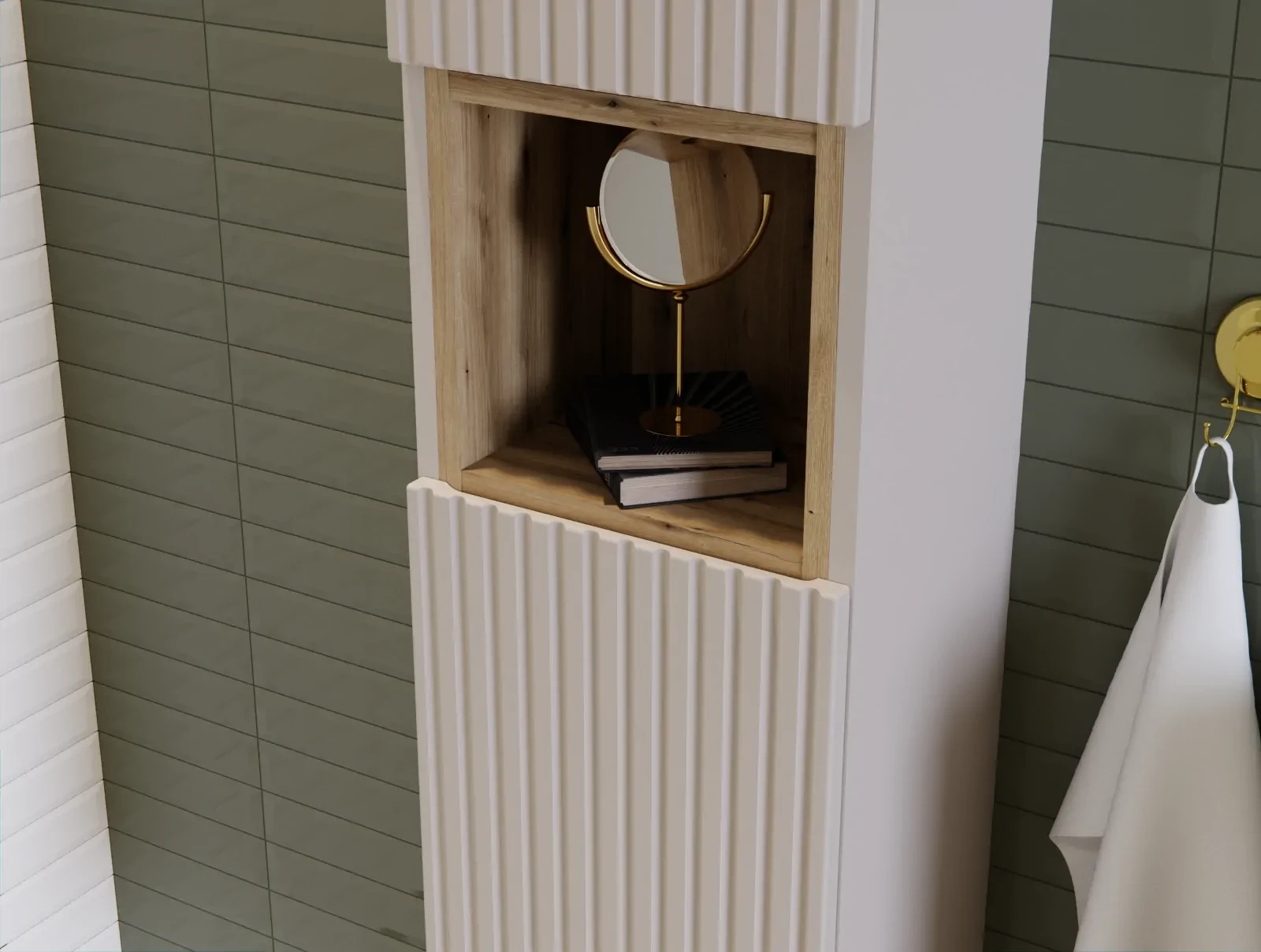 Zestaw łazienkowy Nova Cashmere jest doskonałym przykładem, jak nowoczesność może iść w parze z elegancją. Składający się z ośmiu elementów (2 x szafki pod umywalkę, blatu, 2 x umywalki nablatowej Beyond, szafki wysokiej, szafki pod blat oraz wkładu qubik), zestaw wyróżnia się przede wszystkim minimalistycznym designem i funkcjonalnością. Dzięki pojemnym szufladom i półkom, wszystkie niezbędne akcesoria łazienkowe mogą być zorganizowane i łatwo dostępne, co pomaga utrzymać w pomieszczeniu porządek. Zestaw wykonany został z płyty laminowanej i MDF, co gwarantuje jej trwałość i łatwość w utrzymaniu, co jest kluczowe w wilgotnym środowisku łazienki. Fronty mebli charakteryzują się pionowymi frezowaniami, które dodają całości nowoczesnego charakteru i są nie tylko praktyczne, ale i dekoracyjne. Wiszący typ montażu szafek pozwala na łatwe utrzymanie czystości podłogi, a także optycznie powiększa przestrzeń. Zestaw Nova Cashmere, dzięki swojemu ponadczasowemu designowi, świetnie komponuje się z innymi meblami z tej samej serii, co pozwala na stworzenie harmonijnego i spójnego wystroju łazienki. To rozwiązanie sprawdzi się zarówno w małych, jak i dużych przestrzeniach, dostarczając estetycznego uzupełnienia wnętrza oraz niezawodnej funkcjonalności na lata użytkowania.