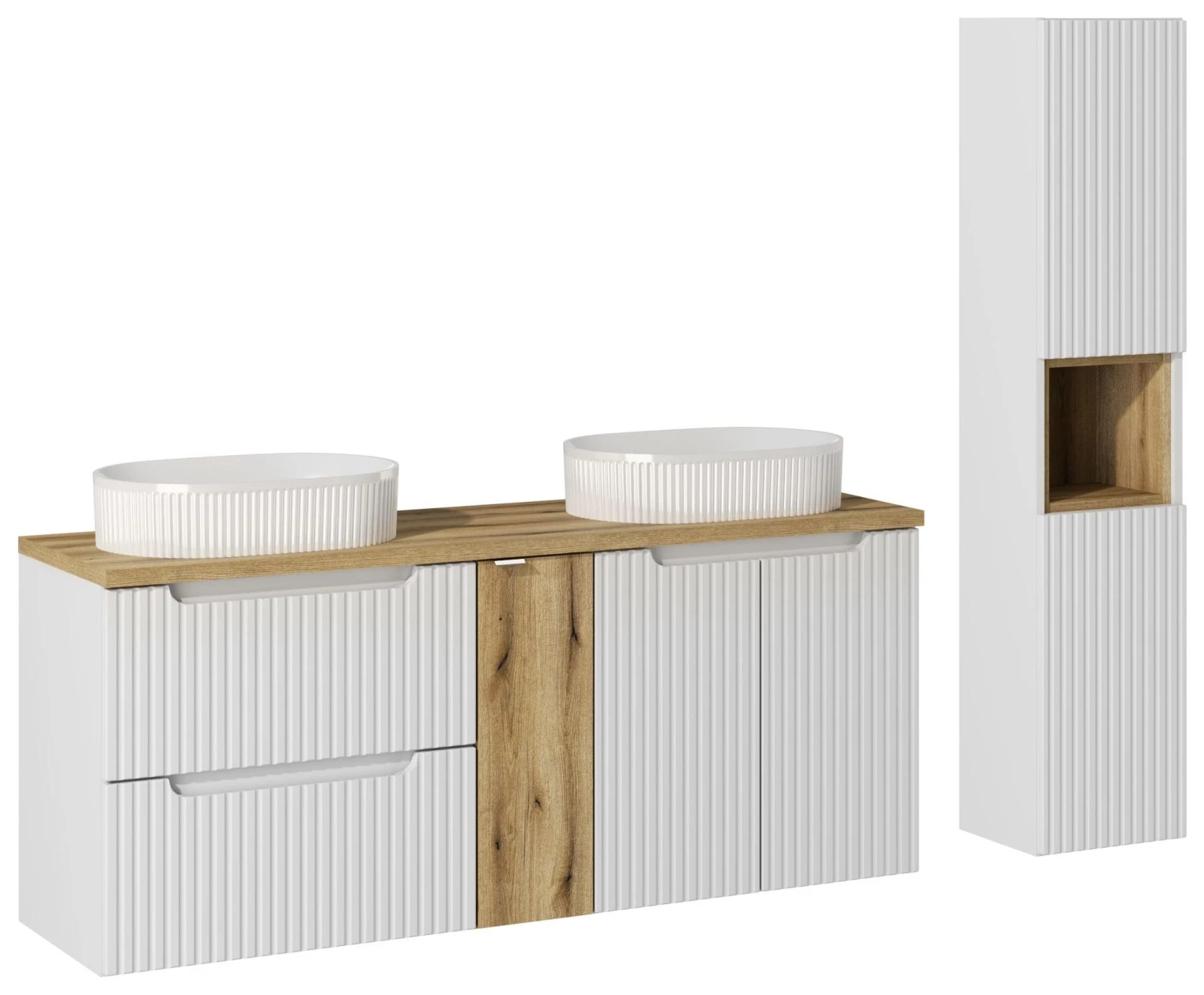 Zestaw mebli łazienkowych NOVA WHITE z dwoma umywalkami BEYOND i blatem dąb 140 cm - 6 elementów