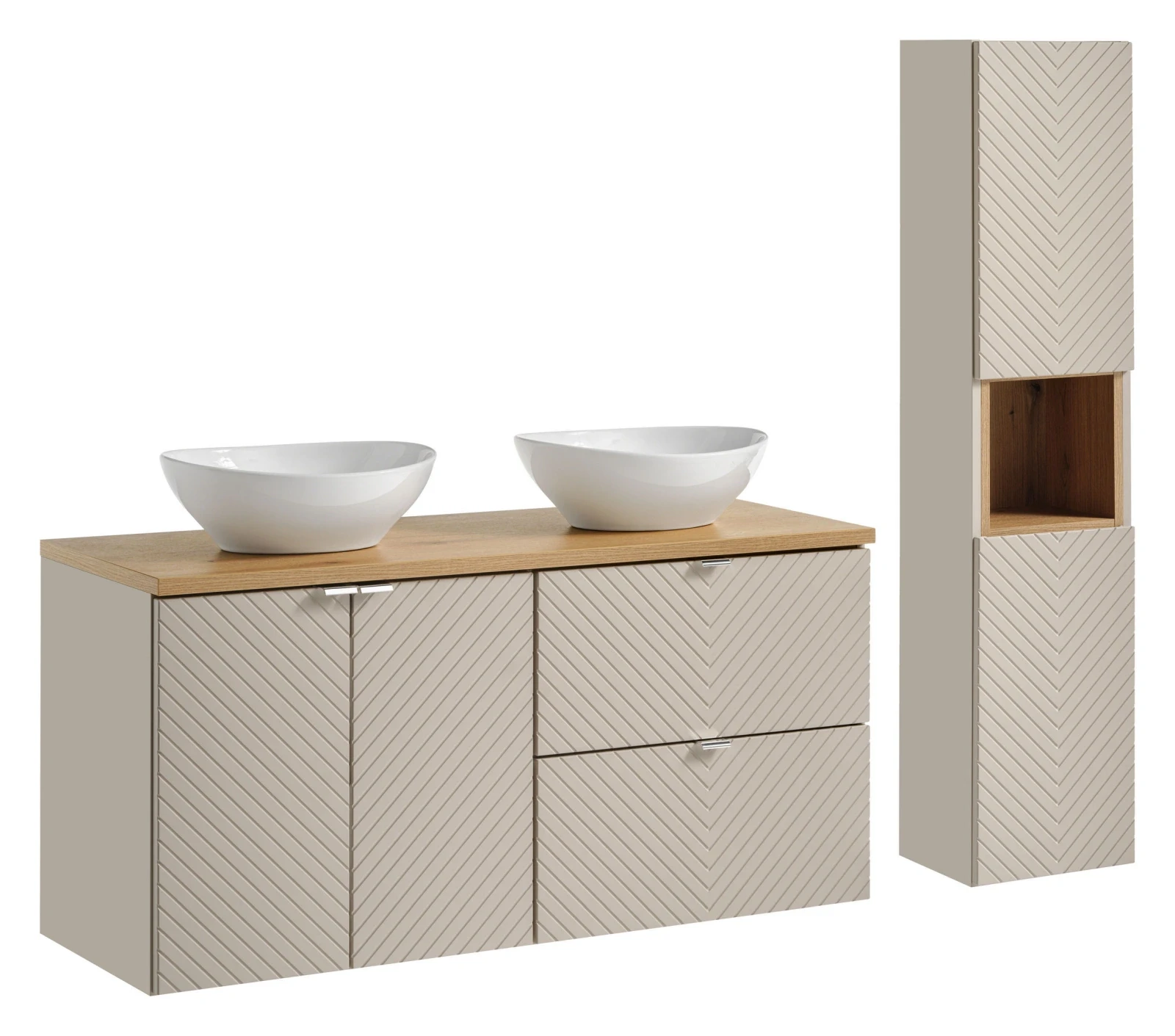 Zestaw mebli łazienkowych VIVA CASHMERE z dwoma umywalkami LOLA i blatem dąb 120 cm - 7 elementów