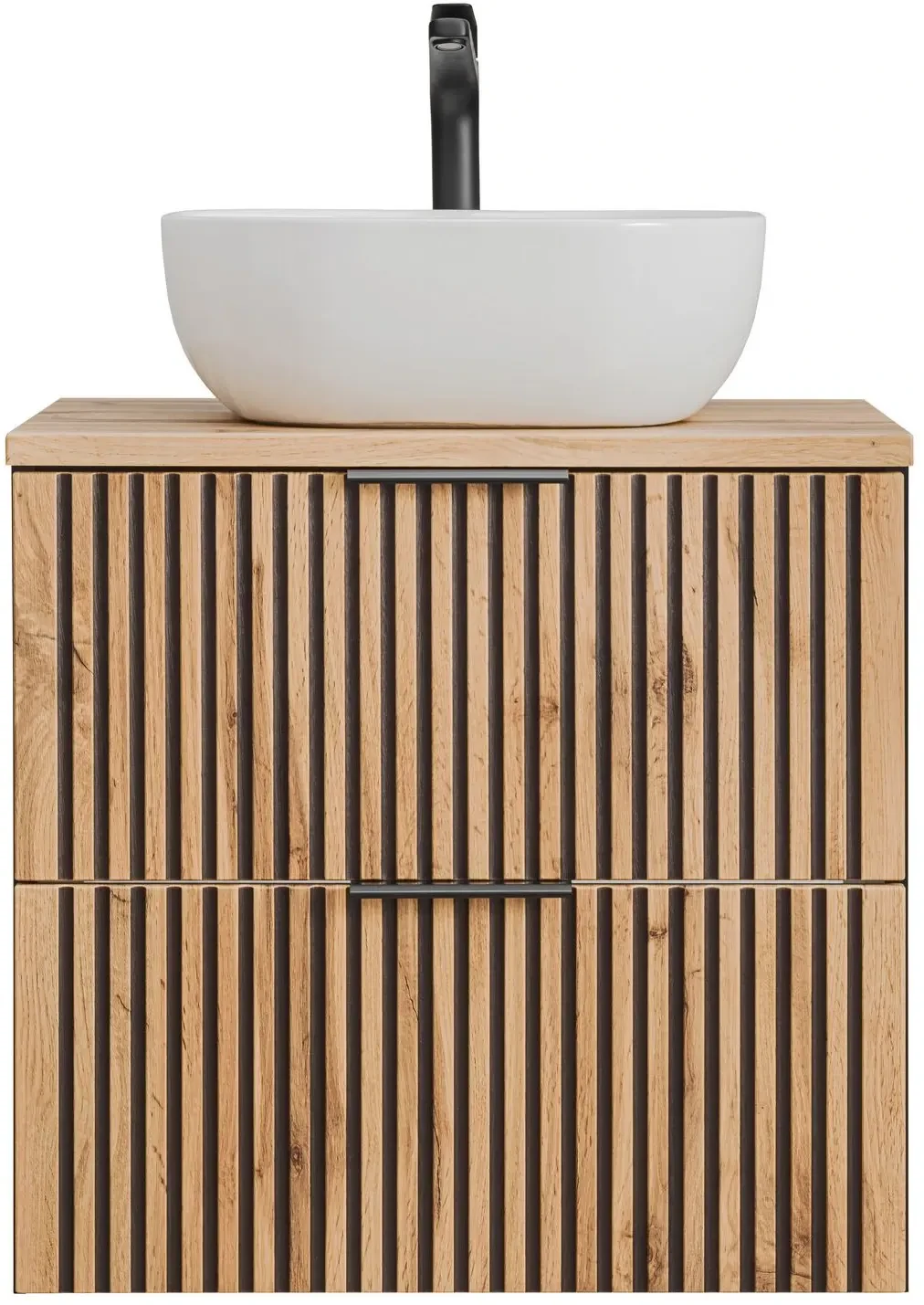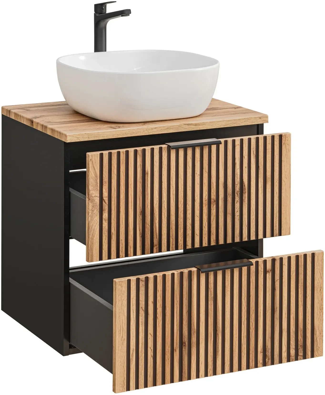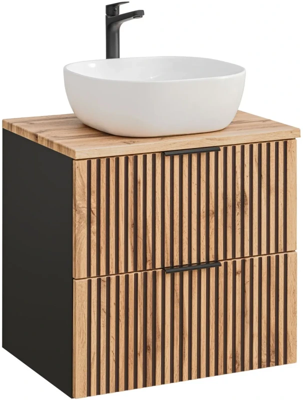 Szafka łazienkowa XILO to nowoczesny i elegancki mebel o szerokości 60 cm, który doskonale wpasuje się w każdą łazienkę. Wisząca konstrukcja ułatwia utrzymanie czystości pod meblem, co jest praktycznym rozwiązaniem w codziennym użytkowaniu. Szafka wyposażona w dwie pojemne szuflady oferuje obszerne miejsce do przechowywania różnorodnych przedmiotów łazienkowych. Umywalka nablatowa dodaje szafce praktyczności i stylu. Mebel wykonany jest z wytrzymałej płyty laminowanej oraz MDF, co gwarantuje jego długowieczność. Ryflowane fronty w pionowy wzór nadają unikalnego charakteru, a cichy domyk szuflad zapewnia komfort użytkowania. Możliwość doboru innych mebli z tej samej serii XILO pozwala na stworzenie spójnej i funkcjonalnej aranżacji łazienkowej.