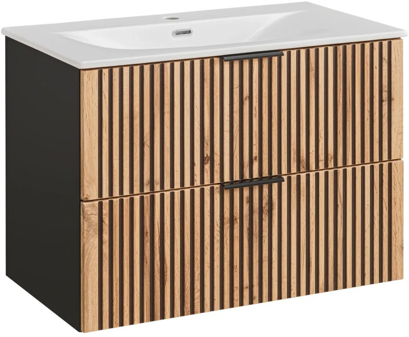 Szafka łazienkowa XILO to nowoczesny i elegancki mebel o szerokości 80 cm, który doskonale wpasuje się w każdą łazienkę. Wisząca konstrukcja ułatwia utrzymanie czystości pod meblem, co jest praktycznym rozwiązaniem w codziennym użytkowaniu. Szafka wyposażona w dwie pojemne szuflady oferuje obszerne miejsce do przechowywania różnorodnych przedmiotów łazienkowych. Umywalka meblowa dodaje szafce praktyczności i stylu. Mebel wykonany jest z wytrzymałej płyty laminowanej oraz MDF, co gwarantuje jego długowieczność. Ryflowane fronty w pionowy wzór nadają unikalnego charakteru, a cichy domyk szuflad zapewnia komfort użytkowania. Możliwość doboru innych mebli z tej samej serii XILO pozwala na stworzenie spójnej i funkcjonalnej aranżacji łazienkowej.