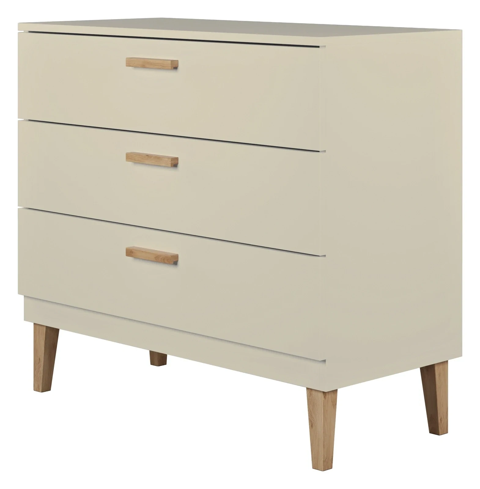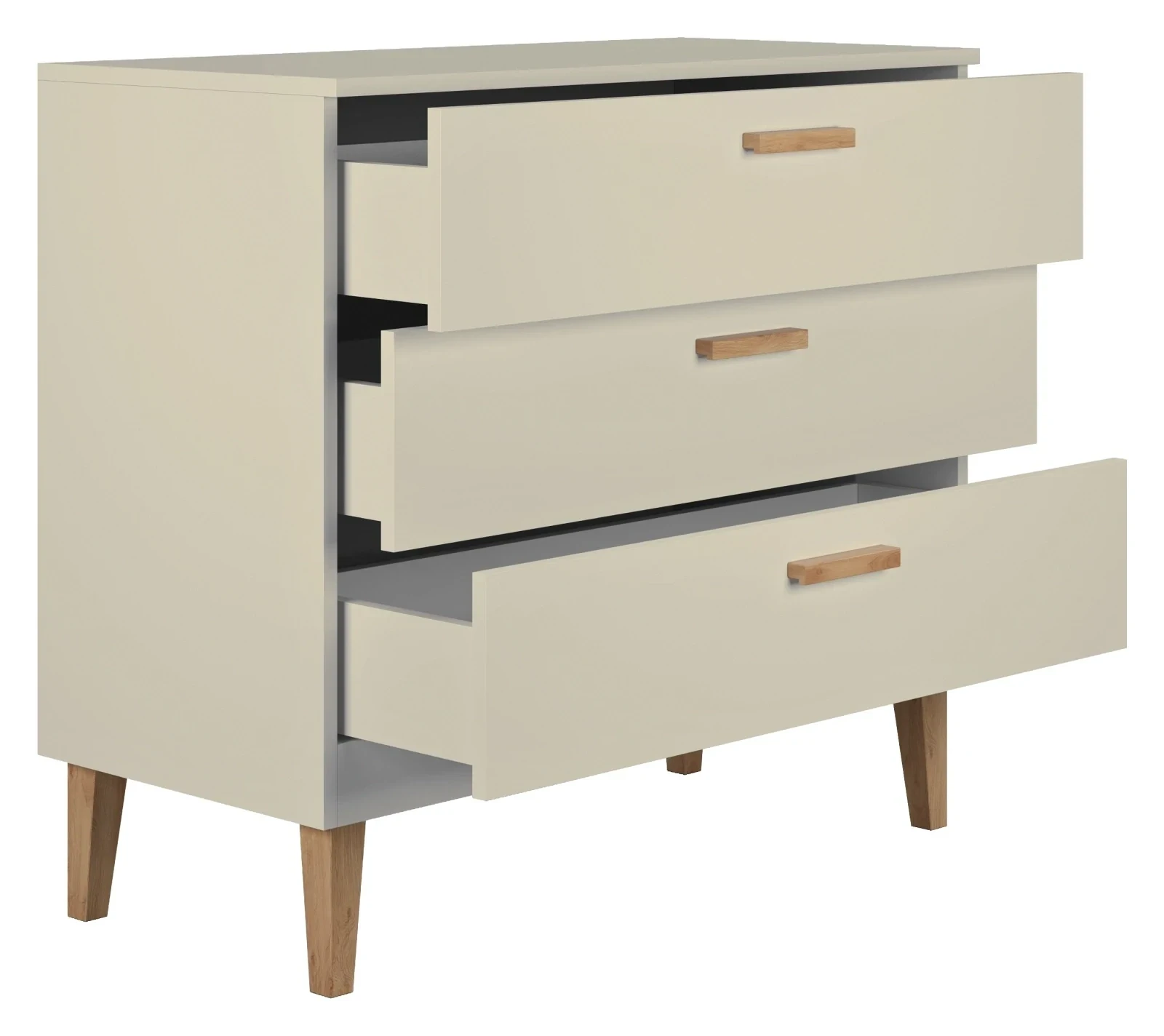 - Komoda posiada 3 pojemne szuflady montowane na wytrzymałych prowadnicach skrzyniowych, z pełnym wysuwem oraz cichym domykiem.