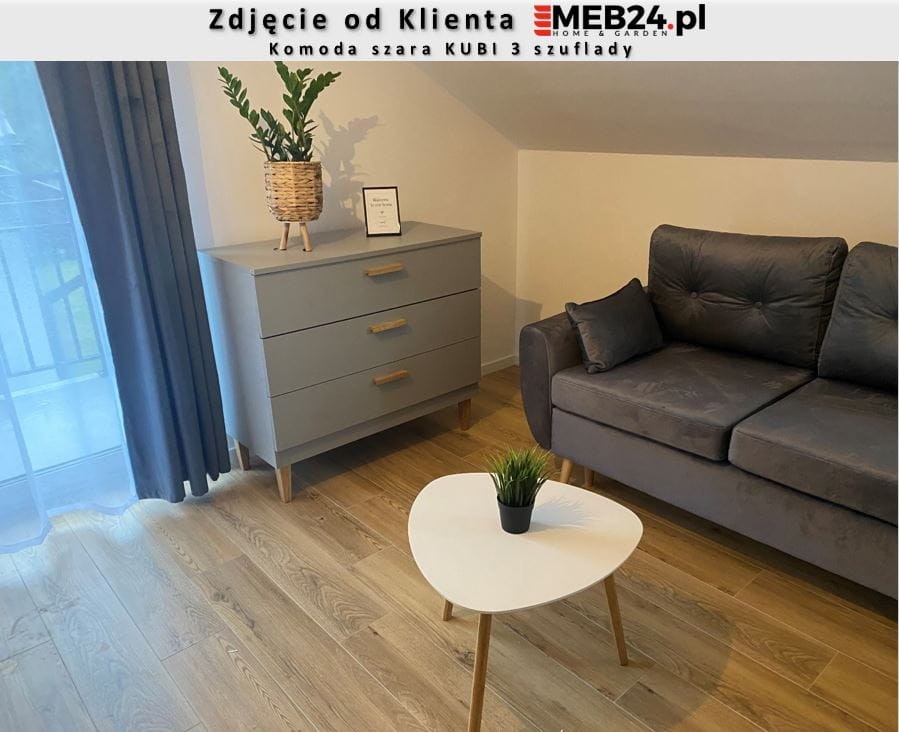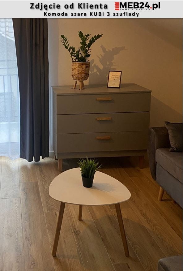 - Komoda posiada 3 pojemne szuflady montowane na wytrzymałych prowadnicach skrzyniowych, z pełnym wysuwem oraz cichym domykiem.